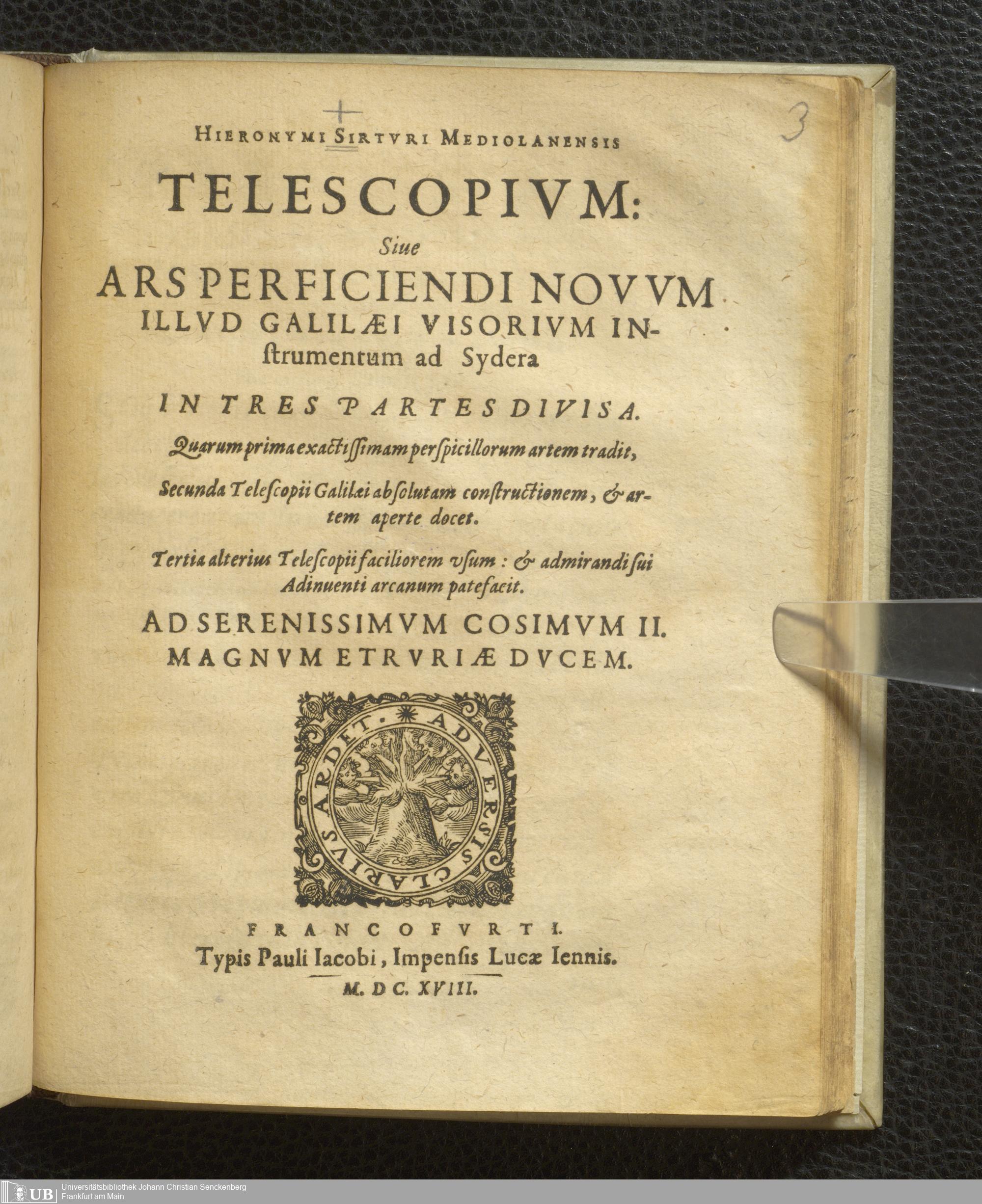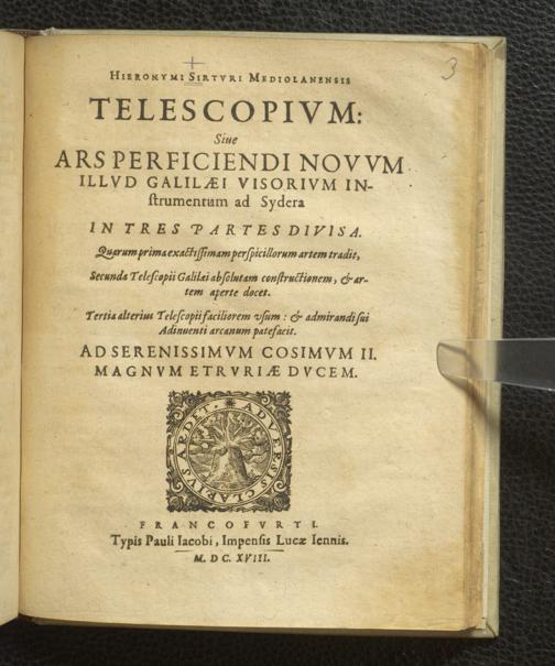 Hieronymi Sirturi Mediolanensis Telescopium: Sive Ars Perficiendi Novum Illud Galilaei Visorium Instrumentum ad Sydera : In Tres Partes Divisa. Quarum prima exactissimam perspicillorum artem tradit, Secunda Telescopii Galilaei absolutam constructionem, & artem aperte docet. Tertia alterius Telescopii faciliorem usum: & admirandi sui Adinventi arcanum patefacit. Ad Serenissimum Cosimum II. Magnum Etruriae Ducem