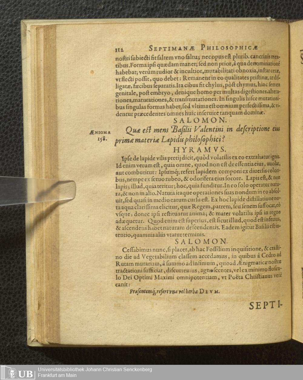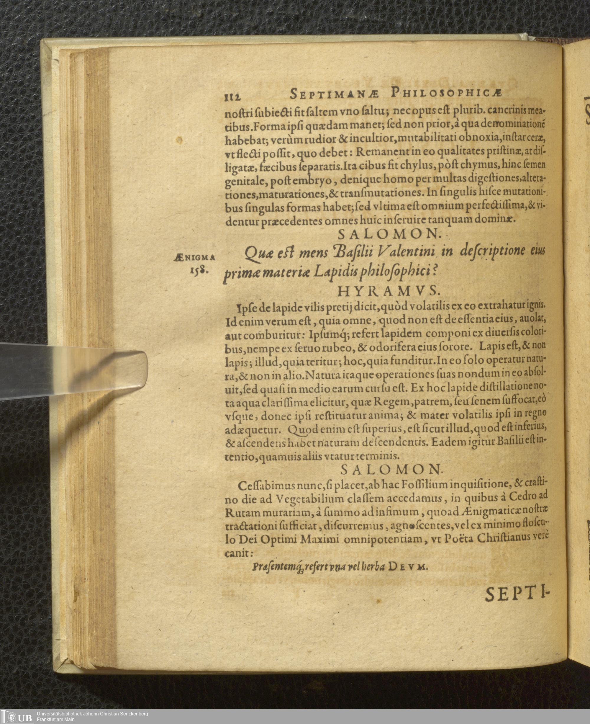 Septimana Philosophica : Qua Aenigmata Aureola De Omni Naturae Genere a Salomone Israe͏̈litarum sapientissimo Rege, & Arabiae Regina Saba, nec non Hyramo, Tyri Principe ... Colloquii proponuntur & enodantur ... / Authore Michaele Maiero ...