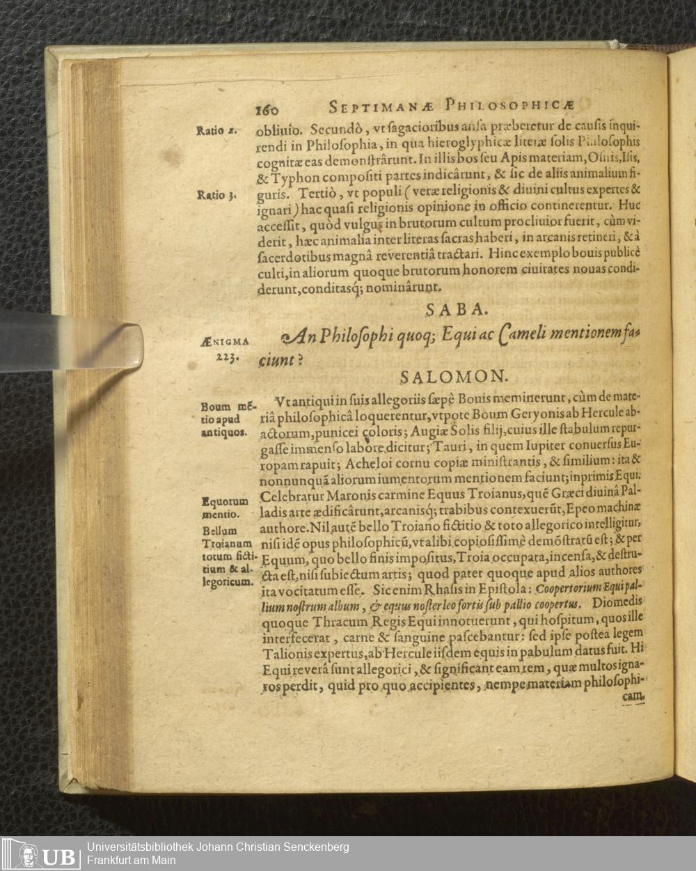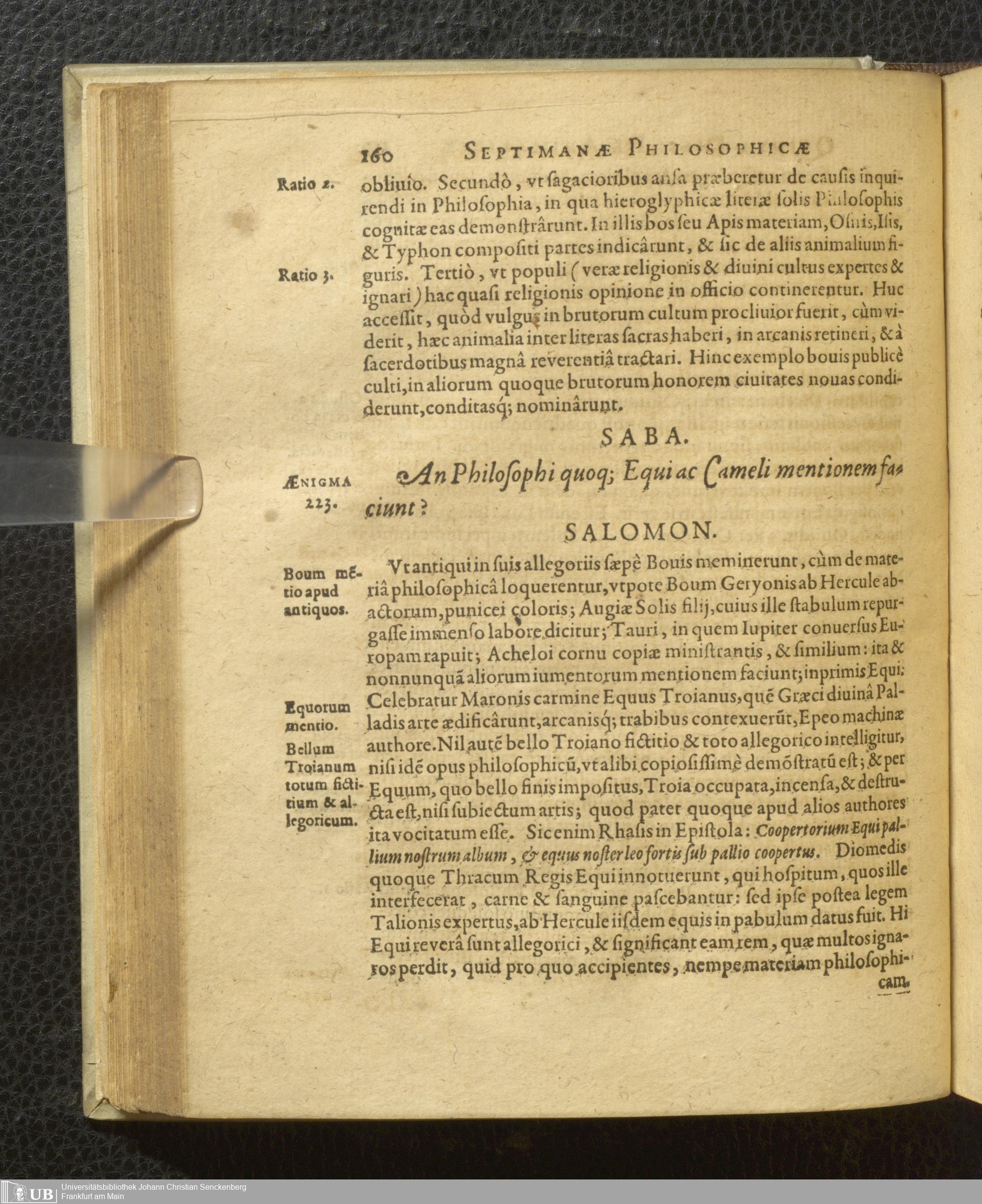 Septimana Philosophica : Qua Aenigmata Aureola De Omni Naturae Genere a Salomone Israe͏̈litarum sapientissimo Rege, & Arabiae Regina Saba, nec non Hyramo, Tyri Principe ... Colloquii proponuntur & enodantur ... / Authore Michaele Maiero ...