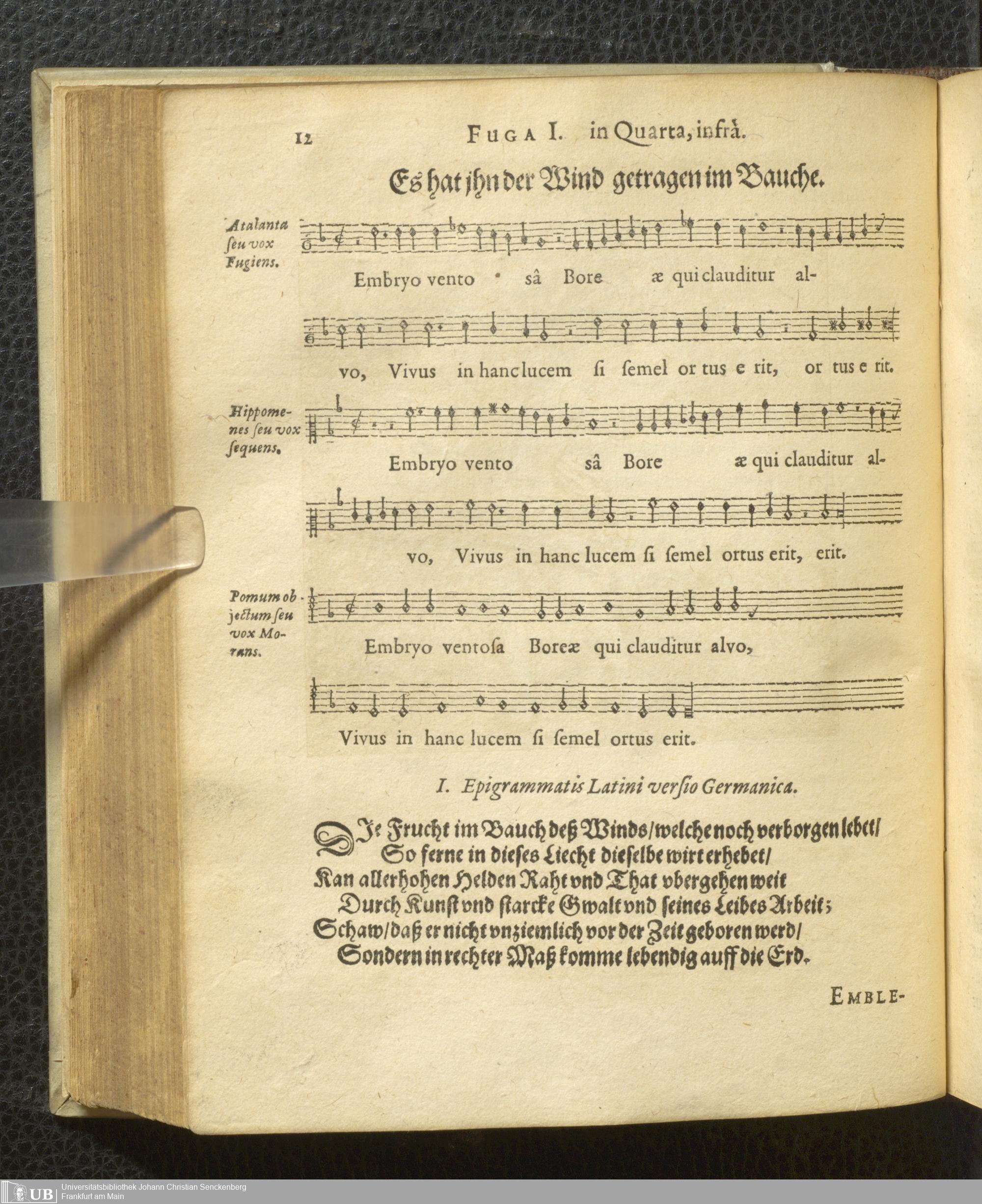 Atalanta fugiens : hoc est, emblemata nova de secretis naturae chymica, accommodata partim oculis et intellectui, figuris cupro incisis, adiectisq́ue sententiis, epigrammatis et notis, partim auribus et recreationis animi plus minus 50 Fugis Musicalibus trium Vocum, quarum duae ad unam simplicem melodiam distichis canendis peraptam, correspondeant, non absque singulari iucunditate videnda, legenda, meditanda, intelligenda, diiudicanda, canenda et audienda / authore Michaele Majero Imperial. Consistorii Comite, Med. D. Eq. ex. etc. ; Illustrationen von Matthaeus Merian, dem Älteren