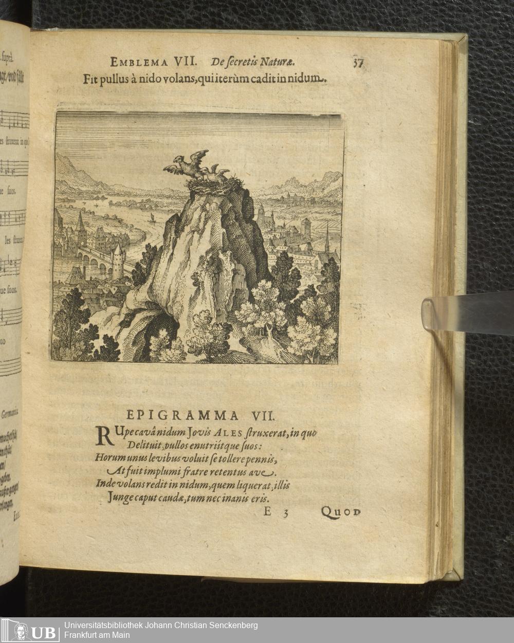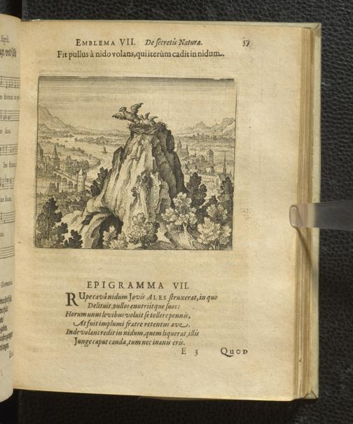 Atalanta fugiens : hoc est, emblemata nova de secretis naturae chymica, accommodata partim oculis et intellectui, figuris cupro incisis, adiectisq́ue sententiis, epigrammatis et notis, partim auribus et recreationis animi plus minus 50 Fugis Musicalibus trium Vocum, quarum duae ad unam simplicem melodiam distichis canendis peraptam, correspondeant, non absque singulari iucunditate videnda, legenda, meditanda, intelligenda, diiudicanda, canenda et audienda / authore Michaele Majero Imperial. Consistorii Comite, Med. D. Eq. ex. etc. ; Illustrationen von Matthaeus Merian, dem Älteren