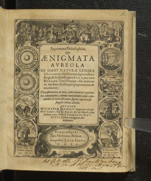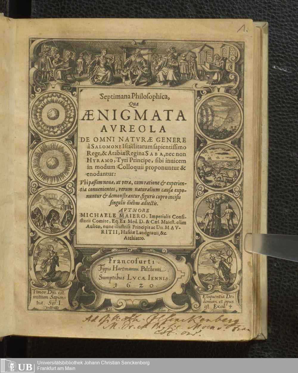 Septimana Philosophica : Qua Aenigmata Aureola De Omni Naturae Genere a Salomone Israe͏̈litarum sapientissimo Rege, & Arabiae Regina Saba, nec non Hyramo, Tyri Principe ... Colloquii proponuntur & enodantur ... / Authore Michaele Maiero ...