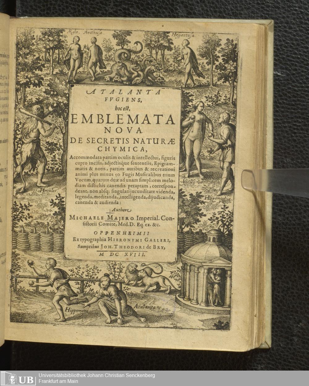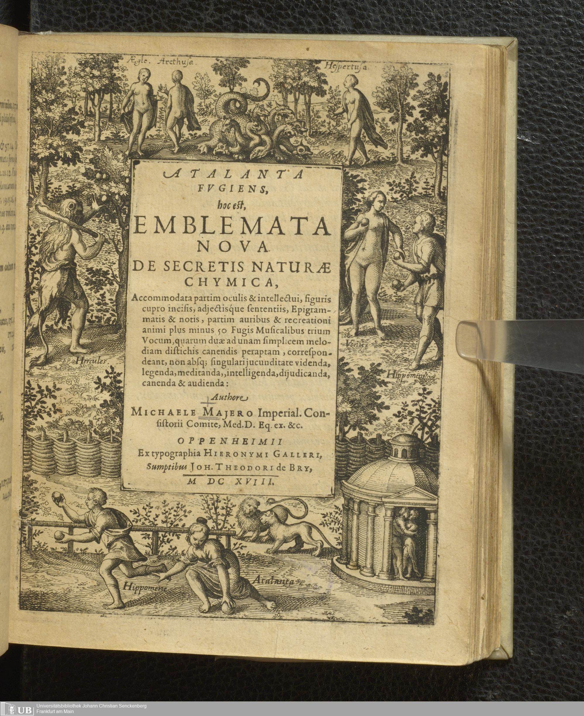 Atalanta fugiens : hoc est, emblemata nova de secretis naturae chymica, accommodata partim oculis et intellectui, figuris cupro incisis, adiectisq́ue sententiis, epigrammatis et notis, partim auribus et recreationis animi plus minus 50 Fugis Musicalibus trium Vocum, quarum duae ad unam simplicem melodiam distichis canendis peraptam, correspondeant, non absque singulari iucunditate videnda, legenda, meditanda, intelligenda, diiudicanda, canenda et audienda / authore Michaele Majero Imperial. Consistorii Comite, Med. D. Eq. ex. etc. ; Illustrationen von Matthaeus Merian, dem Älteren
