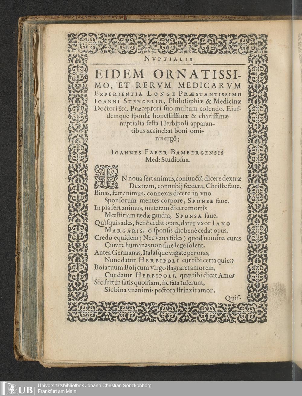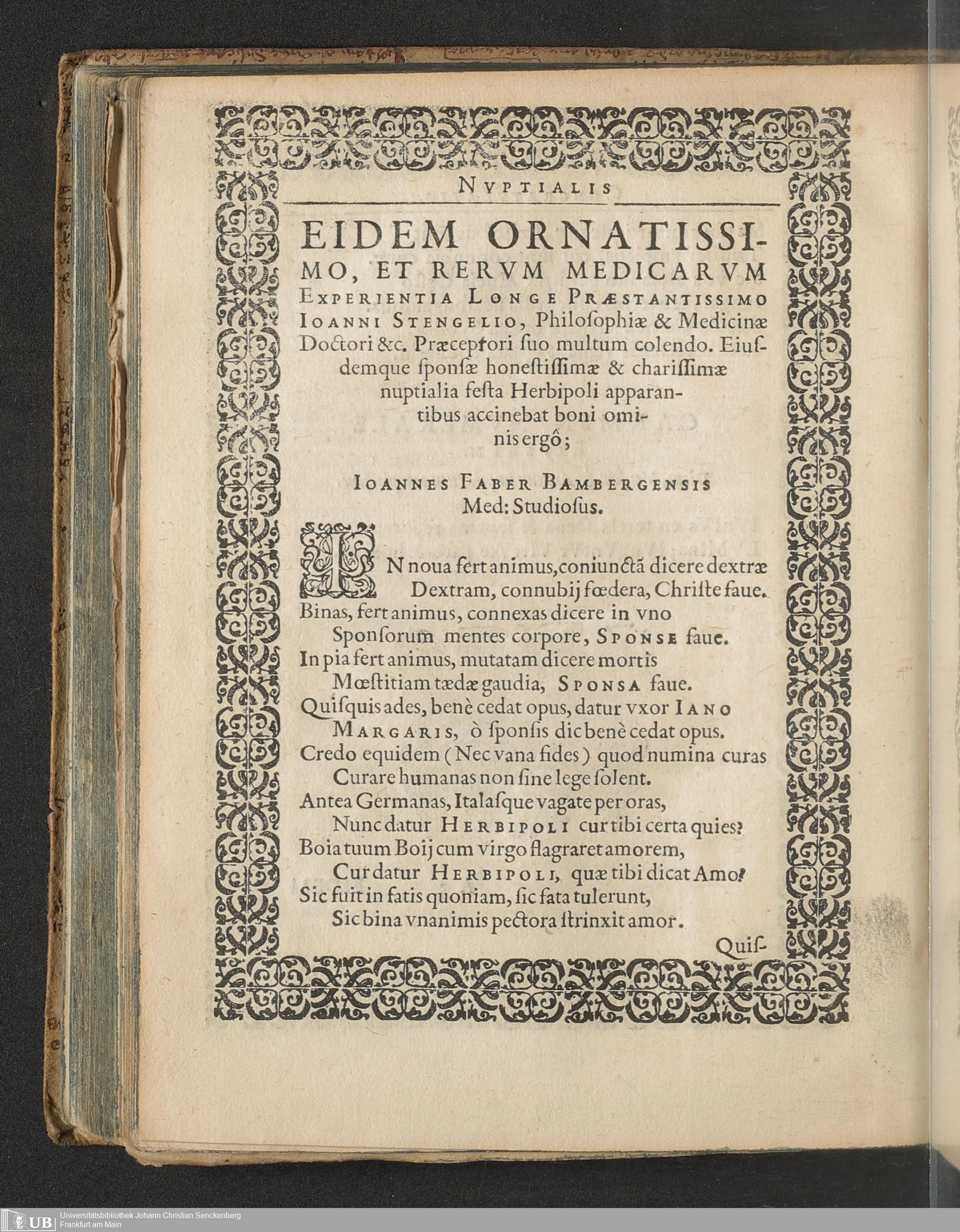 Gamica Syncharisis Sev Nvptialis Congratvlatio Doctrina, Experientiaqve Clarissimo Viro, Domino Ioanni Stengelio, Medicinae Doctori, eiusdemque facultatis in alma Herbipolensium Academia professori dignissimo, praeceptori suo maxime colendo ... / inscripta a M. Pavlo Stromario Ingolstadiensi Et Ioanne Fabro Bambergensi Medicinae Studiosis