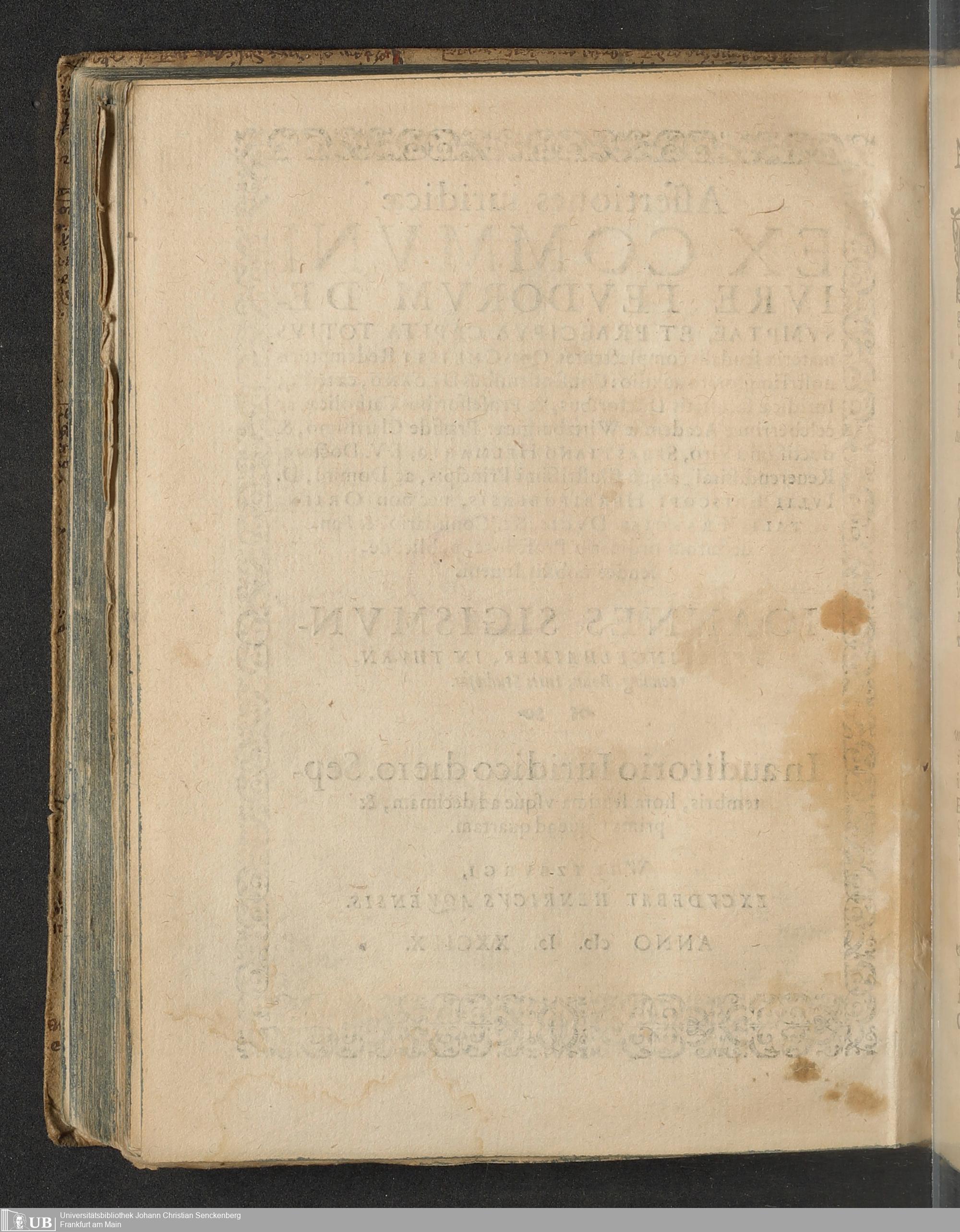 Assertiones iuridicae Ex Commvni Ivre Fevdorvm Desvmptae, Et Praecipva Capita Totivs materiae feudalis complectentes / Quas ... Academiae Wirtzburgicae, Praeside ... Sebastiano Helmario, I.V.Doctore, ... atqué ... D. Ivlii Episcopi Herbipolensis, nec non Orientalis Franciae Dvcis, &c. Consiliaro, & Pandectarum ordinario Professore, publicè defendet ... Ioannes Sigismvndvs Stingelhaimer, In Thvrntenning. Boius, Iuris Studiosus. ...