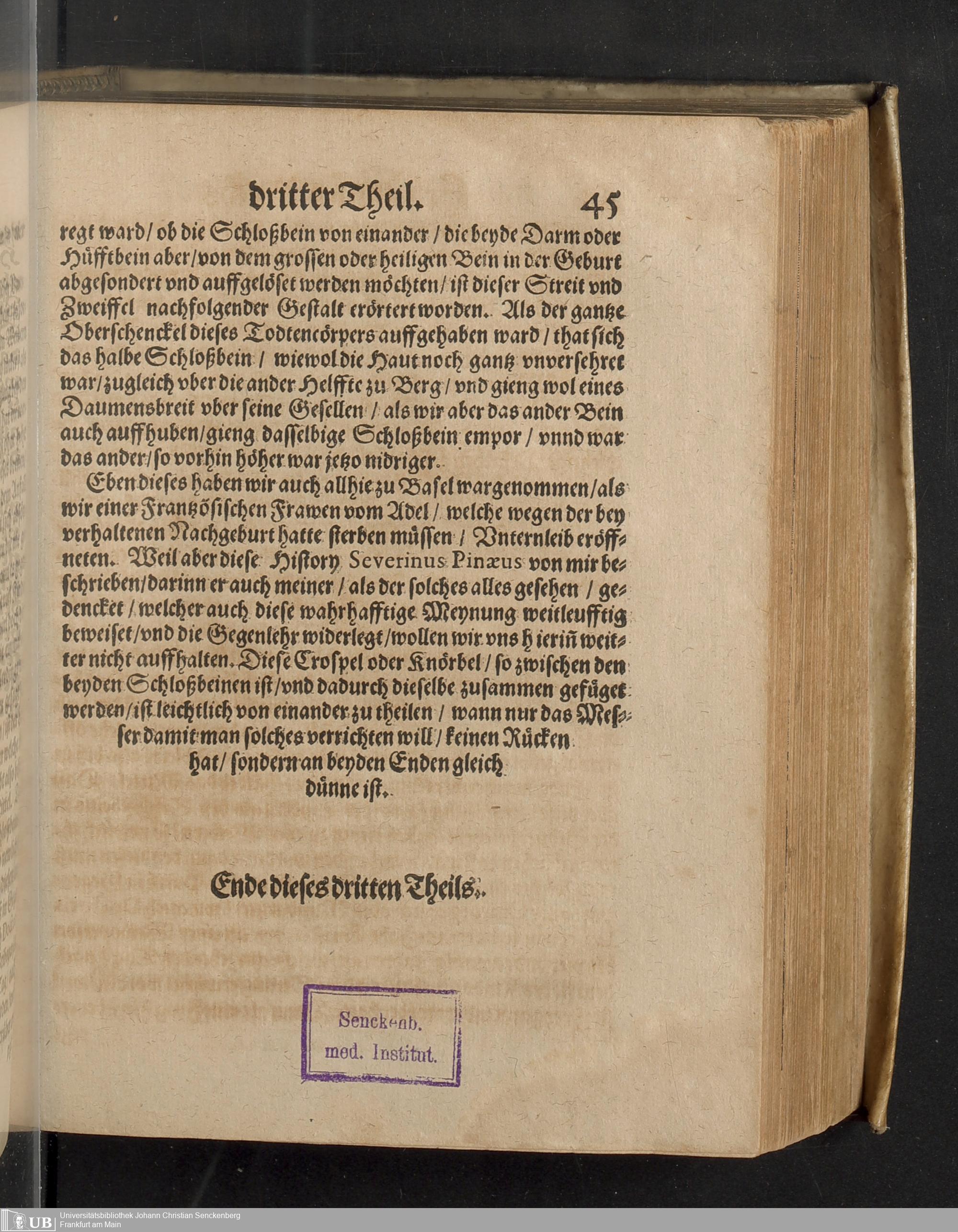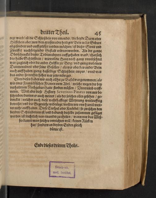 dritter Theil (1626) In welchem Von dem vierdten Theil der weiblichen Gebährmutter, von der Zeit der Bildung deß Kinds in Mutterleib, wann sich dasselbige zu regen beginne, wie es in demselben wachse und zunemme, gehandelt wirt / Mehrertheils auß deß Hocherfahrnen Medici, Severini Pinaei, Anatomischen Tractat, so er in Lateinischer Spraach beschrieben, in das Teutsche ubergesetzt, und umb Gleichheit der Materien willen, den zweyen vorhergehenden Theilen dieses Hebammen Buchs zur Erleuterung angehengt