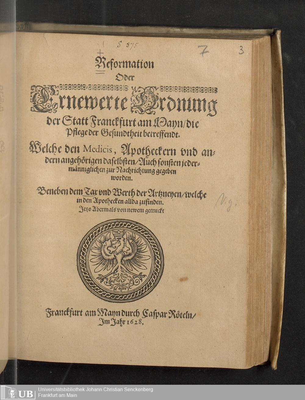 Reformation Oder Ernewerte Ordnung der Statt Franckfurt am Mayn, die Pflege der Gesundtheit betreffendt : Welche den Medicis, Apotheckern vnd andern angehörigen daselbsten, Auch sonsten jedermänniglichen zur Nachrichtung gegeben worden ; Beneben dem Tax vnd Werth der Artzneyen, welche in den Apothecken allda zufinden