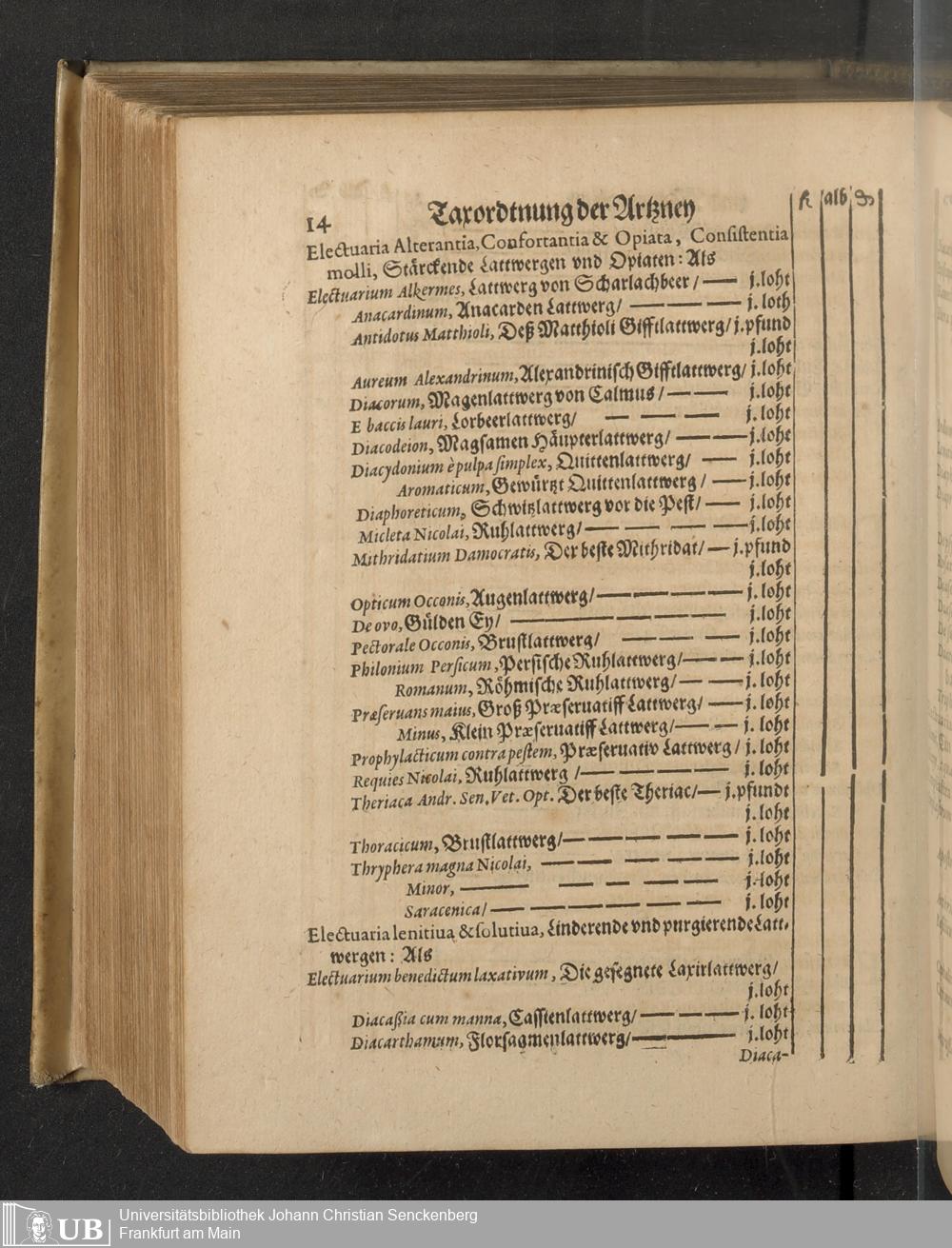 Reformation Oder Ernewerte Ordnung der Statt Franckfurt am Mayn, die Pflege der Gesundtheit betreffendt : Welche den Medicis, Apotheckern vnd andern angehörigen daselbsten, Auch sonsten jedermänniglichen zur Nachrichtung gegeben worden ; Beneben dem Tax vnd Werth der Artzneyen, welche in den Apothecken allda zufinden