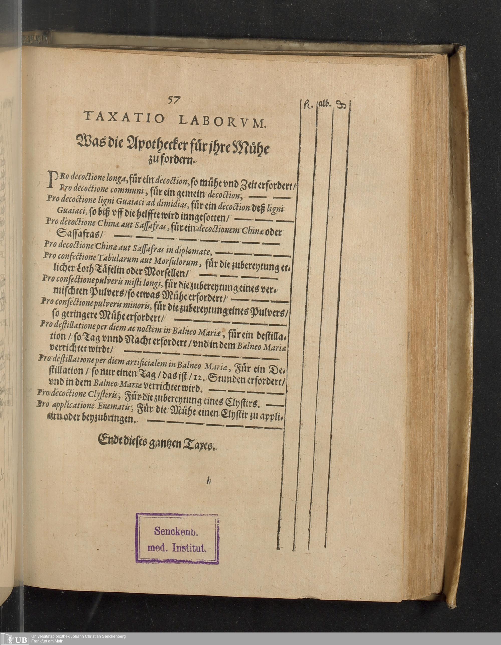 Reformation Oder Ernewerte Ordnung der Statt Franckfurt am Mayn, die Pflege der Gesundtheit betreffendt : Welche den Medicis, Apotheckern vnd andern angehörigen daselbsten, Auch sonsten jedermänniglichen zur Nachrichtung gegeben worden ; Beneben dem Tax vnd Werth der Artzneyen, welche in den Apothecken allda zufinden