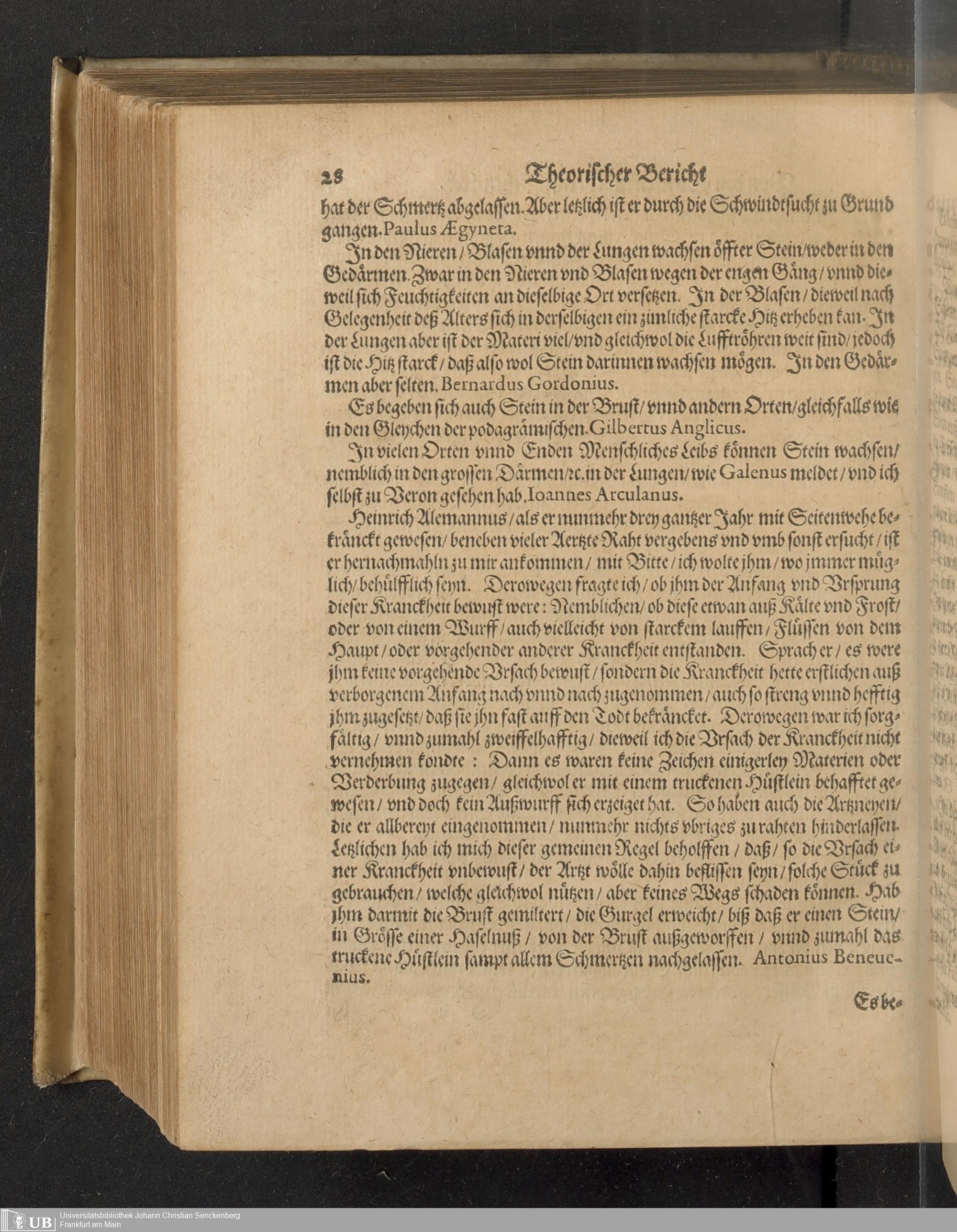 Lithogenesia oder Wunderstein: Von wunderbarem Steingewächs oder Steingeburt in der kleinen Welt, das ist in dem Menschlichen Leib: in dem entweder die Glieder selbst und Corpus zu Stein unnd Felsen worden, oder durch alle unnd jede Leibsglidmassen und Gefäss, nicht minder als in den Ertzgruben der grossen Welt, Stein unnd Mineralia erwachsen : darinnen durch ein kurtzen Theorischen verfasten Discurs die Ursach dero Coagulation im Saltzgeist uffgesucht und eröffnet / anfangs in Latein publiciert und zusammen getragen durch Den Hochgelärten, Joannem Georgium Schenckium a Grafenberg, Medicum, ... ; An itzo aber ... durch einen Liebhaber der Medicin in die Teutsche Zung und Spraach ubersetzt