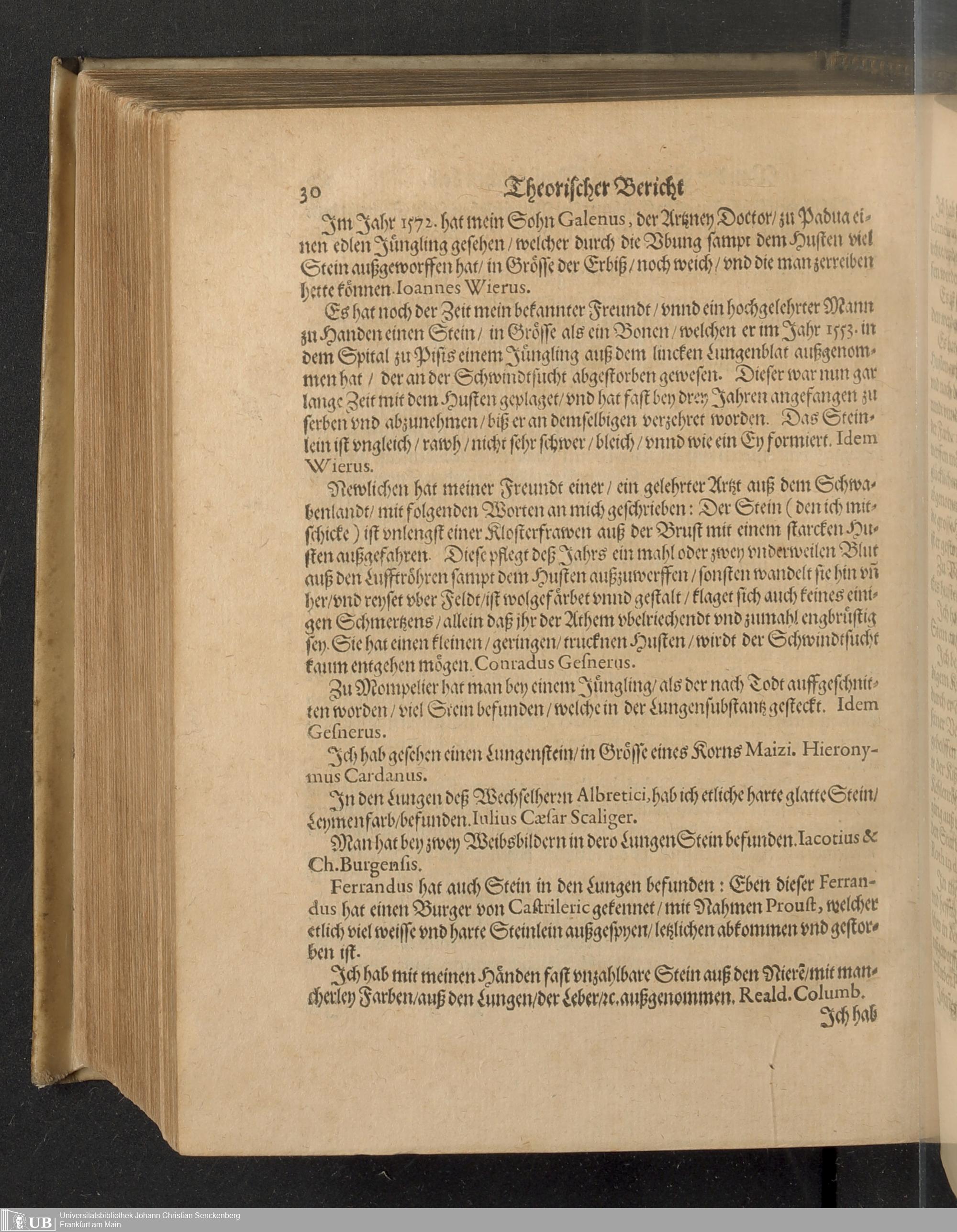 Lithogenesia oder Wunderstein: Von wunderbarem Steingewächs oder Steingeburt in der kleinen Welt, das ist in dem Menschlichen Leib: in dem entweder die Glieder selbst und Corpus zu Stein unnd Felsen worden, oder durch alle unnd jede Leibsglidmassen und Gefäss, nicht minder als in den Ertzgruben der grossen Welt, Stein unnd Mineralia erwachsen : darinnen durch ein kurtzen Theorischen verfasten Discurs die Ursach dero Coagulation im Saltzgeist uffgesucht und eröffnet / anfangs in Latein publiciert und zusammen getragen durch Den Hochgelärten, Joannem Georgium Schenckium a Grafenberg, Medicum, ... ; An itzo aber ... durch einen Liebhaber der Medicin in die Teutsche Zung und Spraach ubersetzt