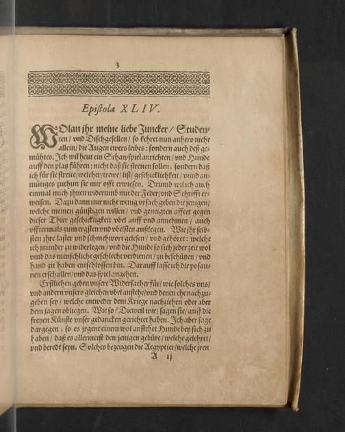 Von Wunderbarer Natur, und Eygenschafft der Hunde : Die vier und viertzigste Epistel, der Ersten Centurien an die Belgas geschrieben, Deß Edlen, Hochgelehrten, und Vortreflichen Herrn Iusti Lipsii, Königlichen Geschichtschreibers, und Professorn auff der weitberümbten Universitet Löven / Auß dem Latein in Teutsch den Narrenköpffen entgegen gesetzt, welche, so nicht unchristlich, doch unerbar, und unweißlich seyn, vermeinen, Hund halten, speisen, und umb sich leiden. a Canisio Procyone