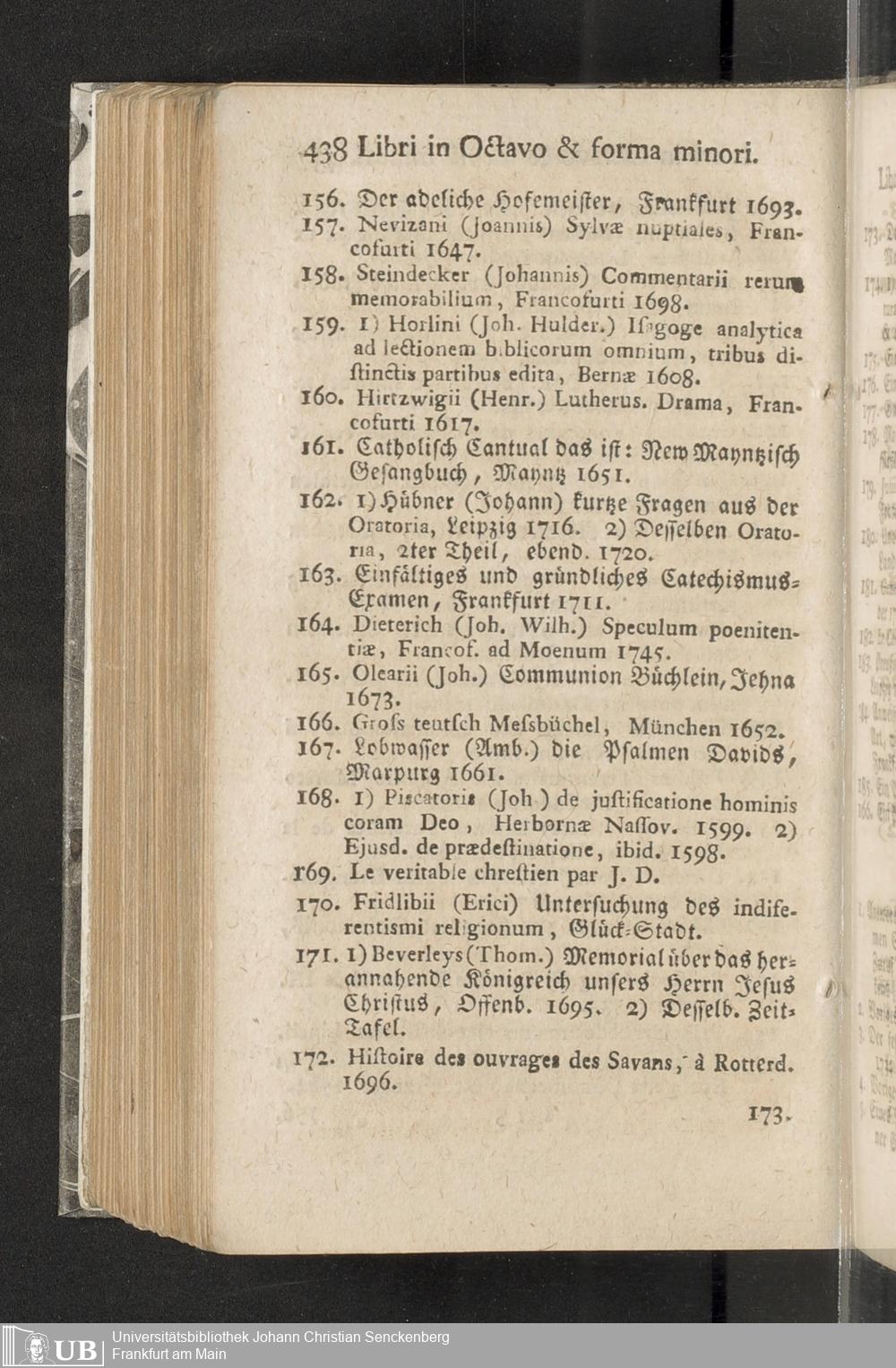 Verzeichniß einer in alle Theile der Gelehrsamkeit einschlagenden Büchersammlung, welche zu Frankfurt am Mayn in dem D. Senckenbergischen Stifts-Hauß auf der grossen Eschenheimergaße den 2ten May und folgende Tage 1785. durch die geschwornen Ausrüfer versteigert werden soll