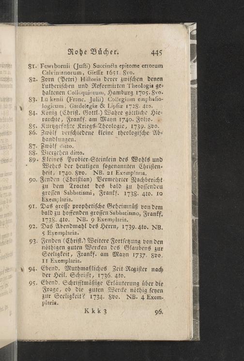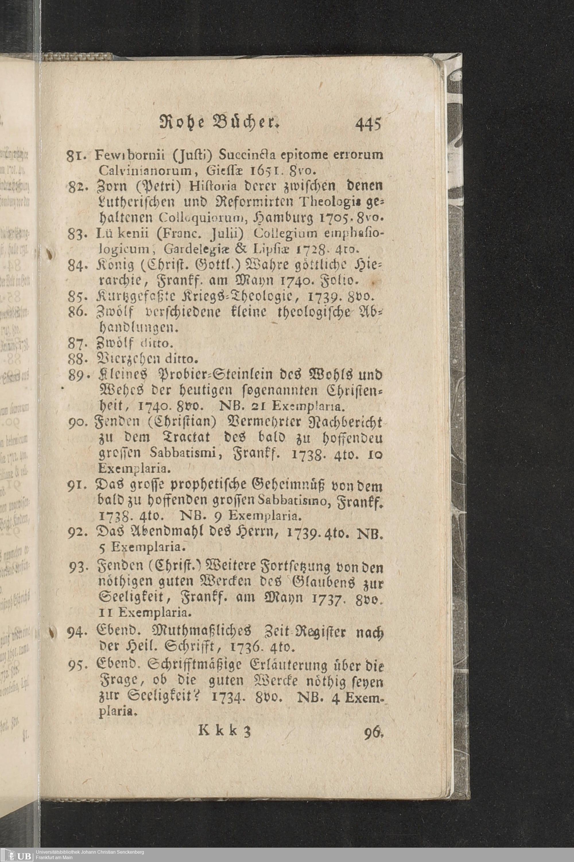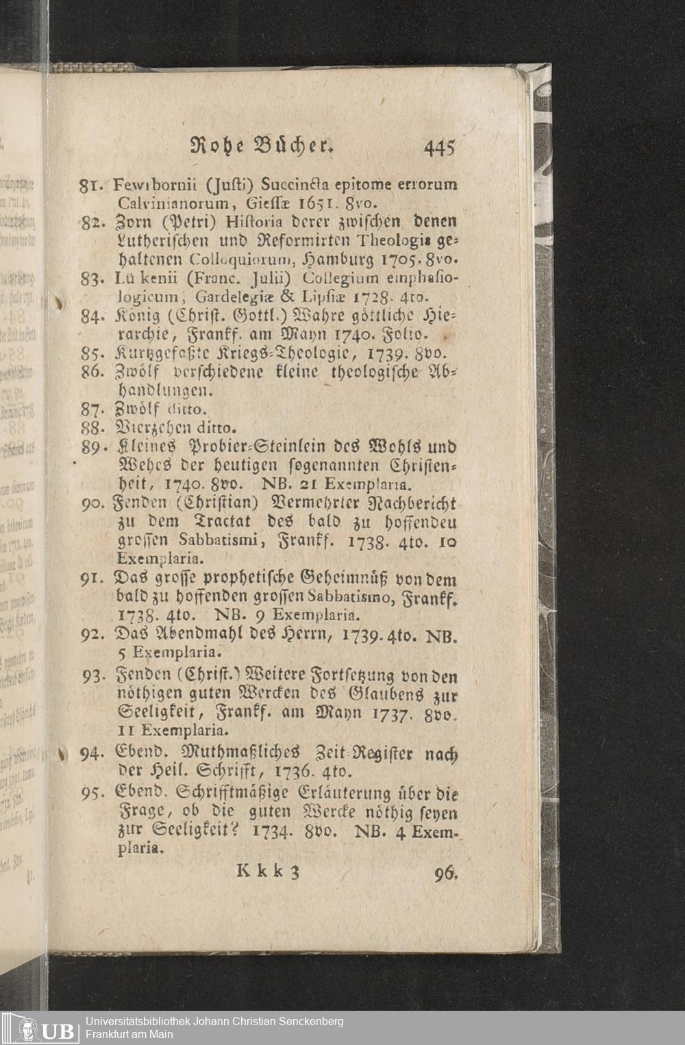 Verzeichniß einer in alle Theile der Gelehrsamkeit einschlagenden Büchersammlung, welche zu Frankfurt am Mayn in dem D. Senckenbergischen Stifts-Hauß auf der grossen Eschenheimergaße den 2ten May und folgende Tage 1785. durch die geschwornen Ausrüfer versteigert werden soll