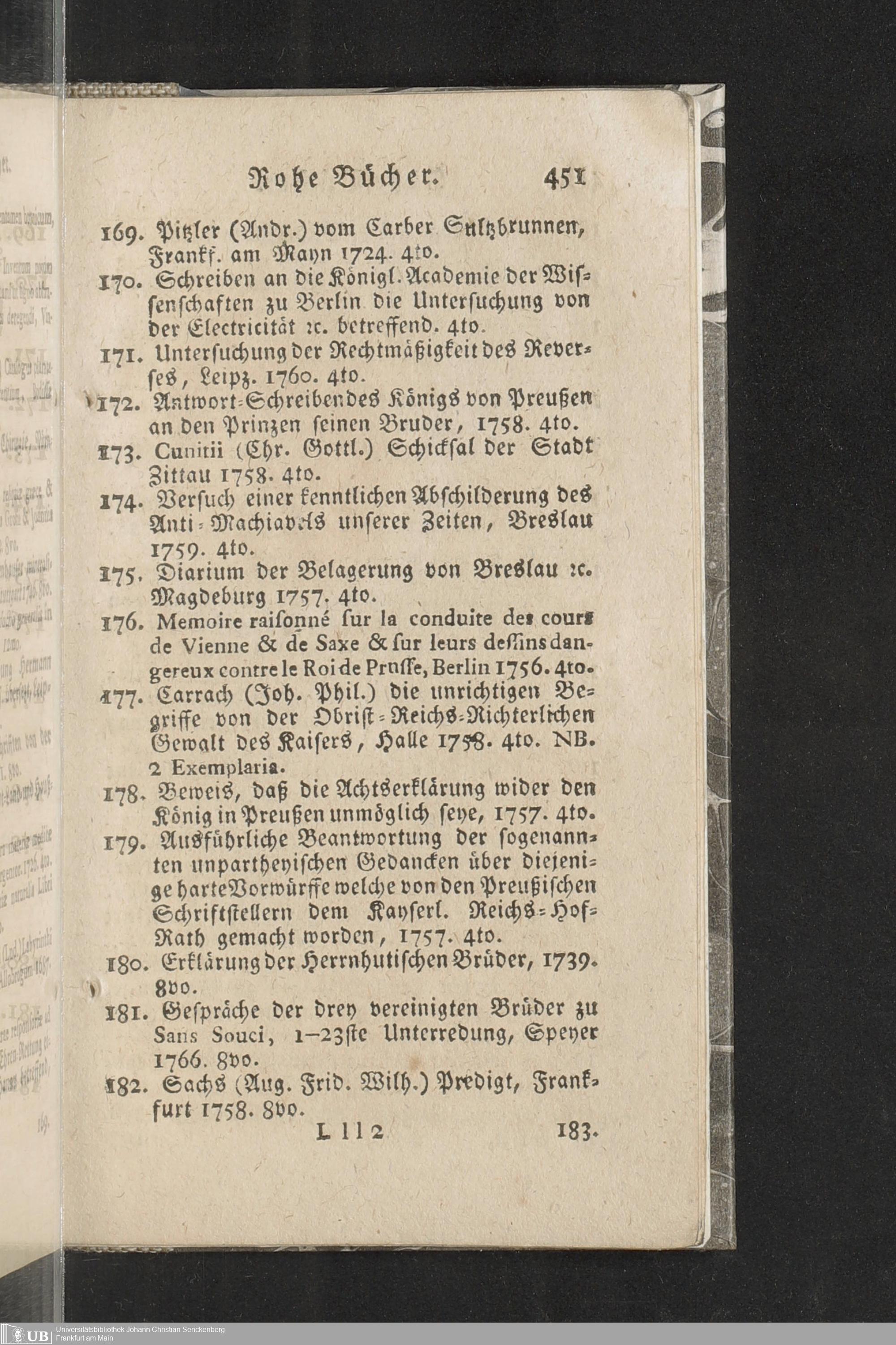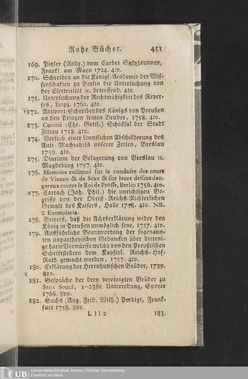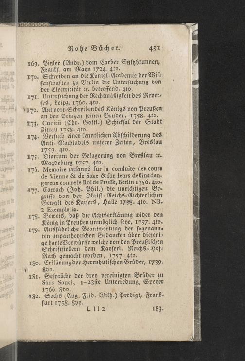 Verzeichniß einer in alle Theile der Gelehrsamkeit einschlagenden Büchersammlung, welche zu Frankfurt am Mayn in dem D. Senckenbergischen Stifts-Hauß auf der grossen Eschenheimergaße den 2ten May und folgende Tage 1785. durch die geschwornen Ausrüfer versteigert werden soll