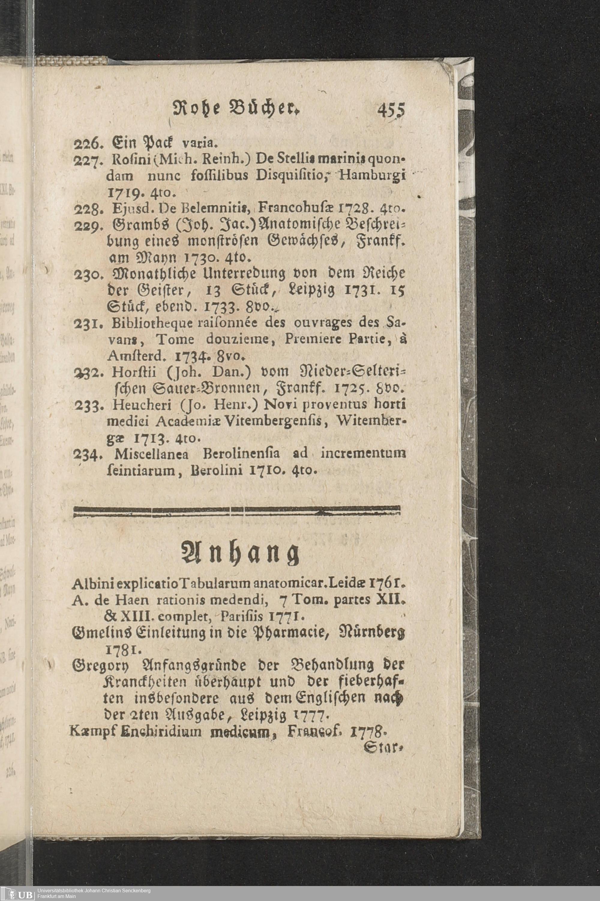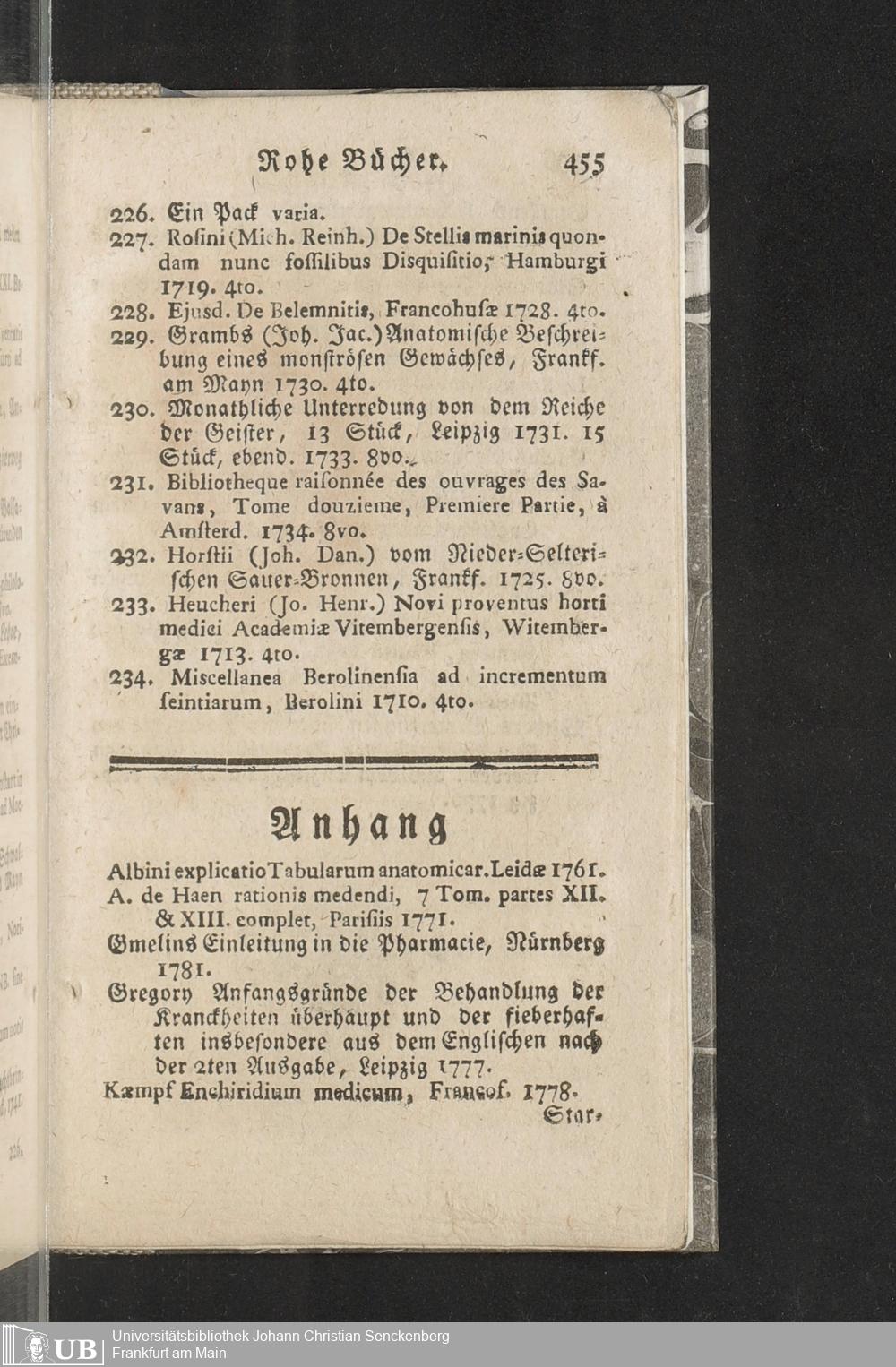 Verzeichniß einer in alle Theile der Gelehrsamkeit einschlagenden Büchersammlung, welche zu Frankfurt am Mayn in dem D. Senckenbergischen Stifts-Hauß auf der grossen Eschenheimergaße den 2ten May und folgende Tage 1785. durch die geschwornen Ausrüfer versteigert werden soll