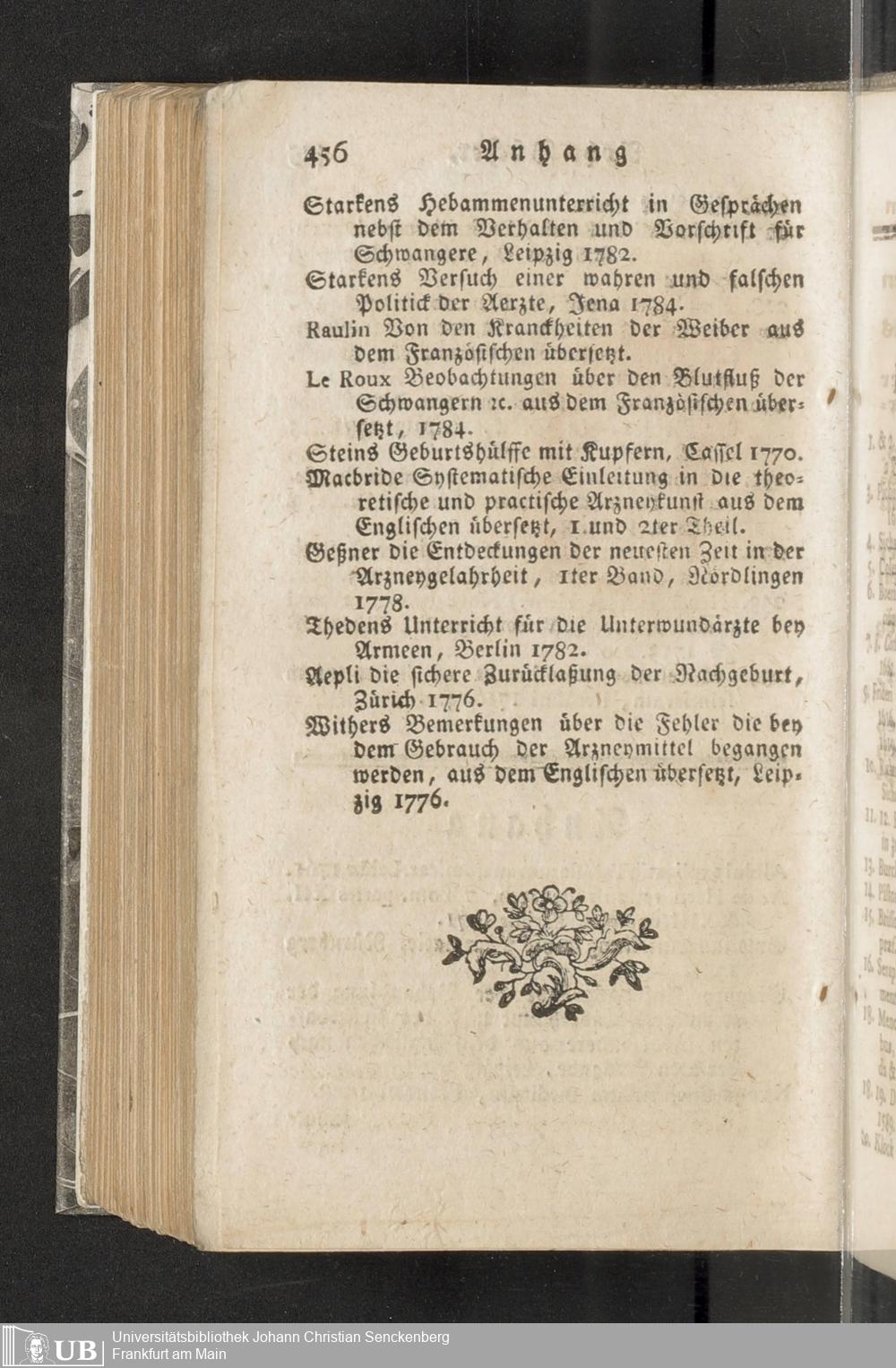 Verzeichniß einer in alle Theile der Gelehrsamkeit einschlagenden Büchersammlung, welche zu Frankfurt am Mayn in dem D. Senckenbergischen Stifts-Hauß auf der grossen Eschenheimergaße den 2ten May und folgende Tage 1785. durch die geschwornen Ausrüfer versteigert werden soll