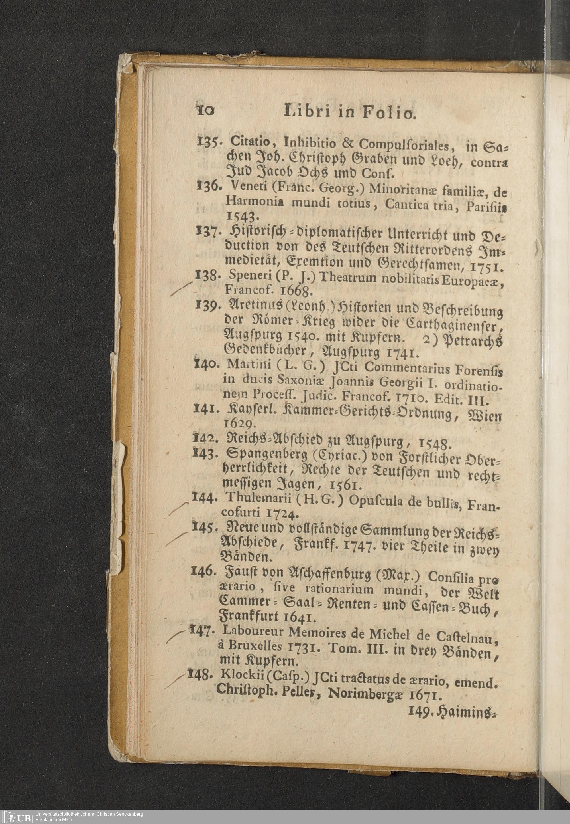 Verzeichniß einer in alle Theile der Gelehrsamkeit einschlagenden Büchersammlung, welche zu Frankfurt am Mayn in dem D. Senckenbergischen Stifts-Hauß auf der grossen Eschenheimergaße den 2ten May und folgende Tage 1785. durch die geschwornen Ausrüfer versteigert werden soll
