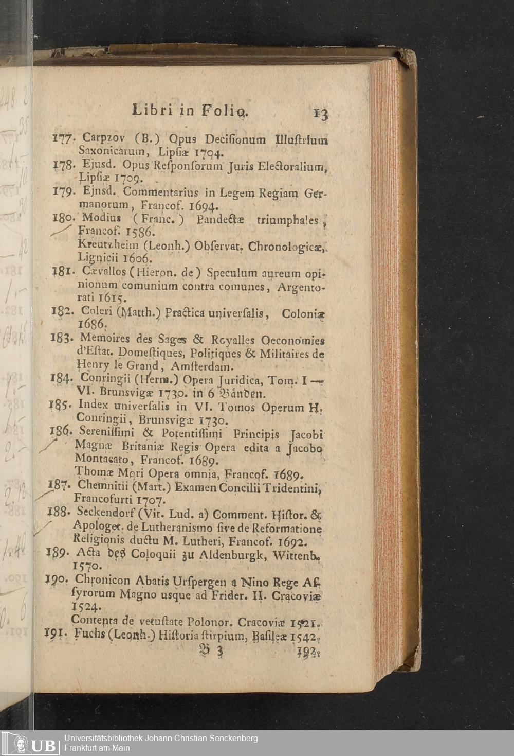 Verzeichniß einer in alle Theile der Gelehrsamkeit einschlagenden Büchersammlung, welche zu Frankfurt am Mayn in dem D. Senckenbergischen Stifts-Hauß auf der grossen Eschenheimergaße den 2ten May und folgende Tage 1785. durch die geschwornen Ausrüfer versteigert werden soll