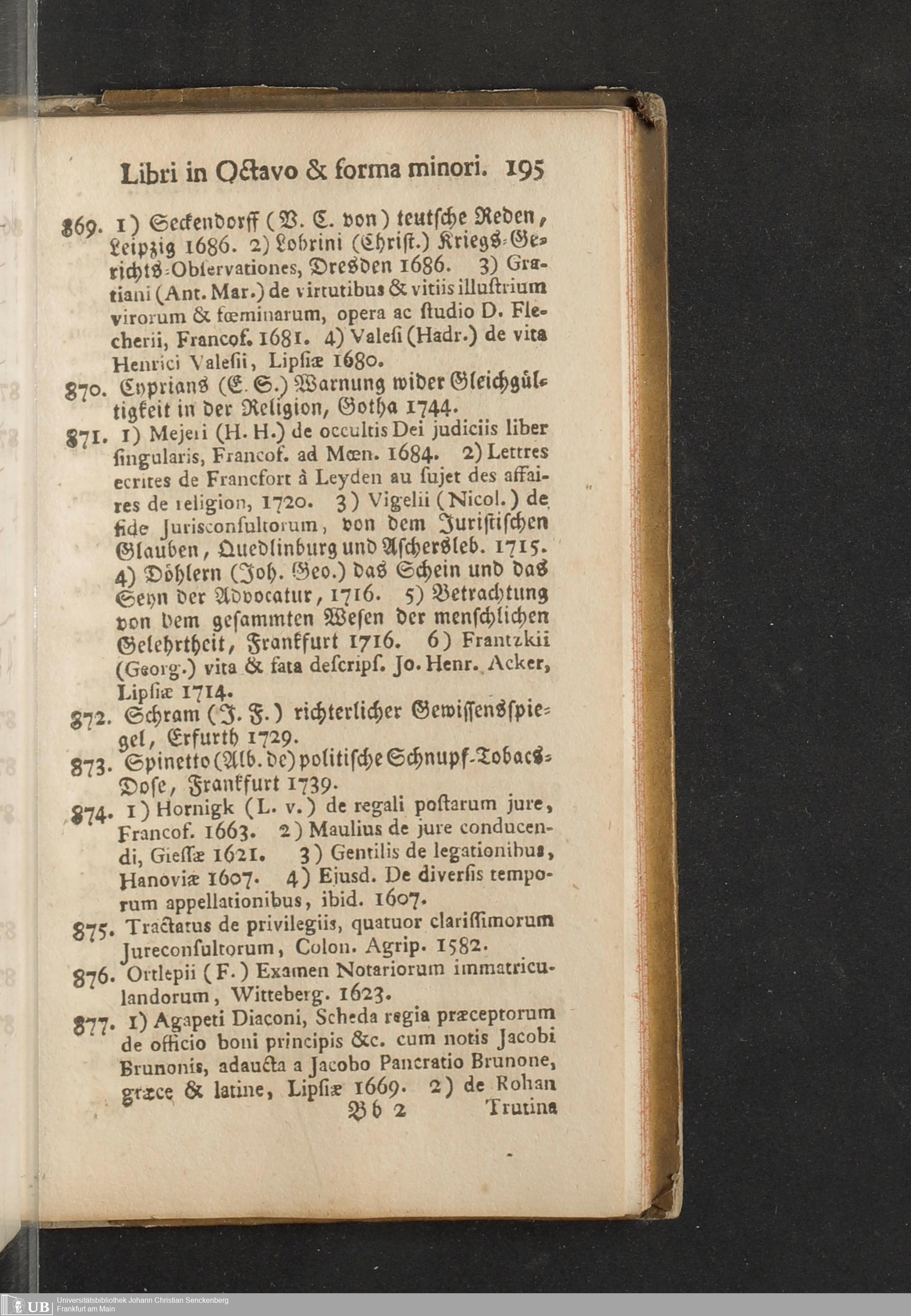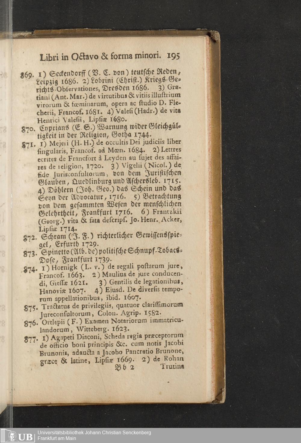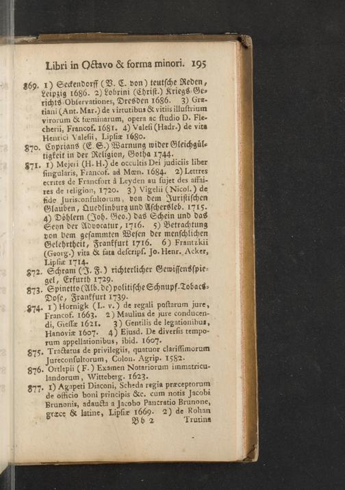 Verzeichniß einer in alle Theile der Gelehrsamkeit einschlagenden Büchersammlung, welche zu Frankfurt am Mayn in dem D. Senckenbergischen Stifts-Hauß auf der grossen Eschenheimergaße den 2ten May und folgende Tage 1785. durch die geschwornen Ausrüfer versteigert werden soll