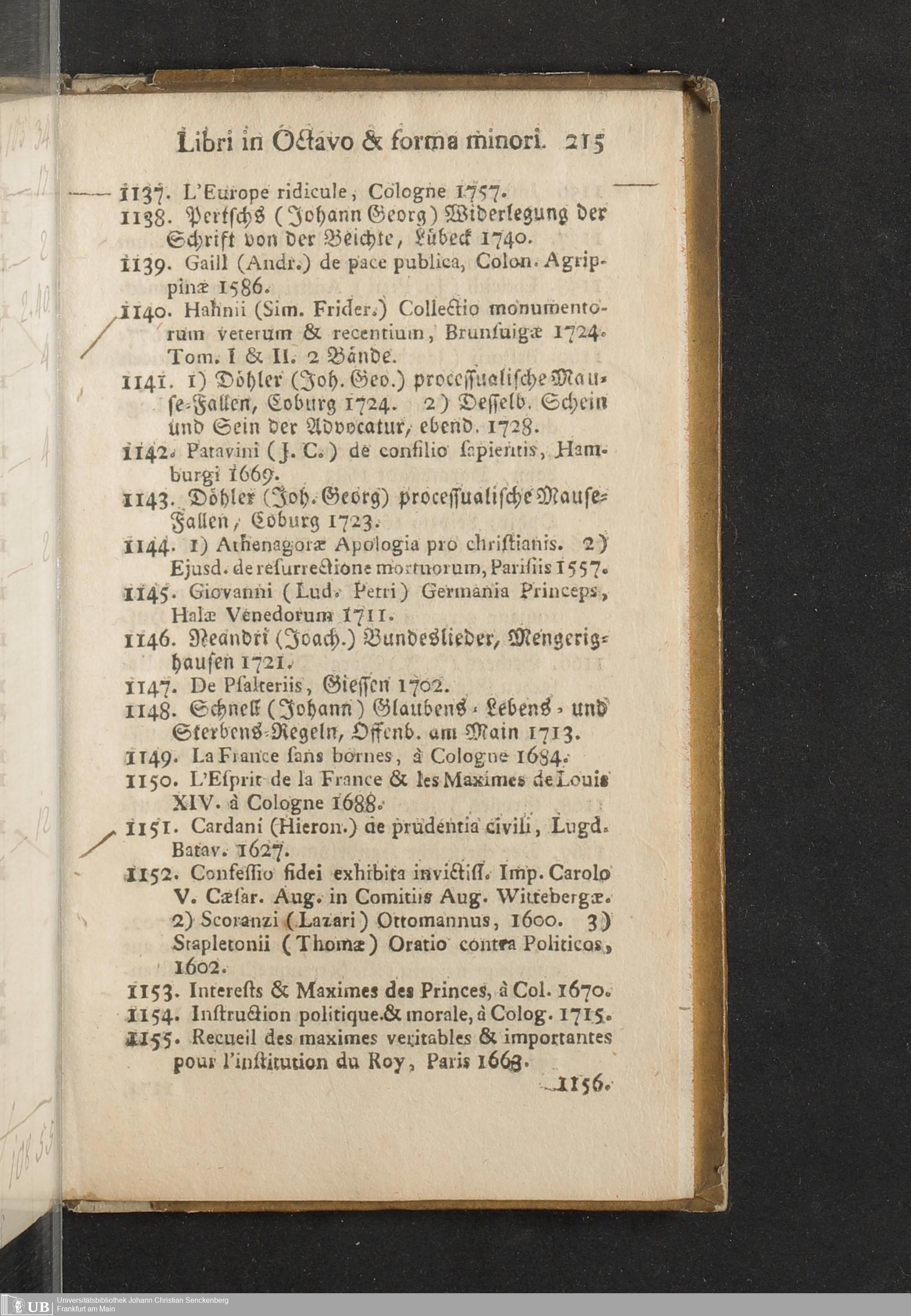 Verzeichniß einer in alle Theile der Gelehrsamkeit einschlagenden Büchersammlung, welche zu Frankfurt am Mayn in dem D. Senckenbergischen Stifts-Hauß auf der grossen Eschenheimergaße den 2ten May und folgende Tage 1785. durch die geschwornen Ausrüfer versteigert werden soll