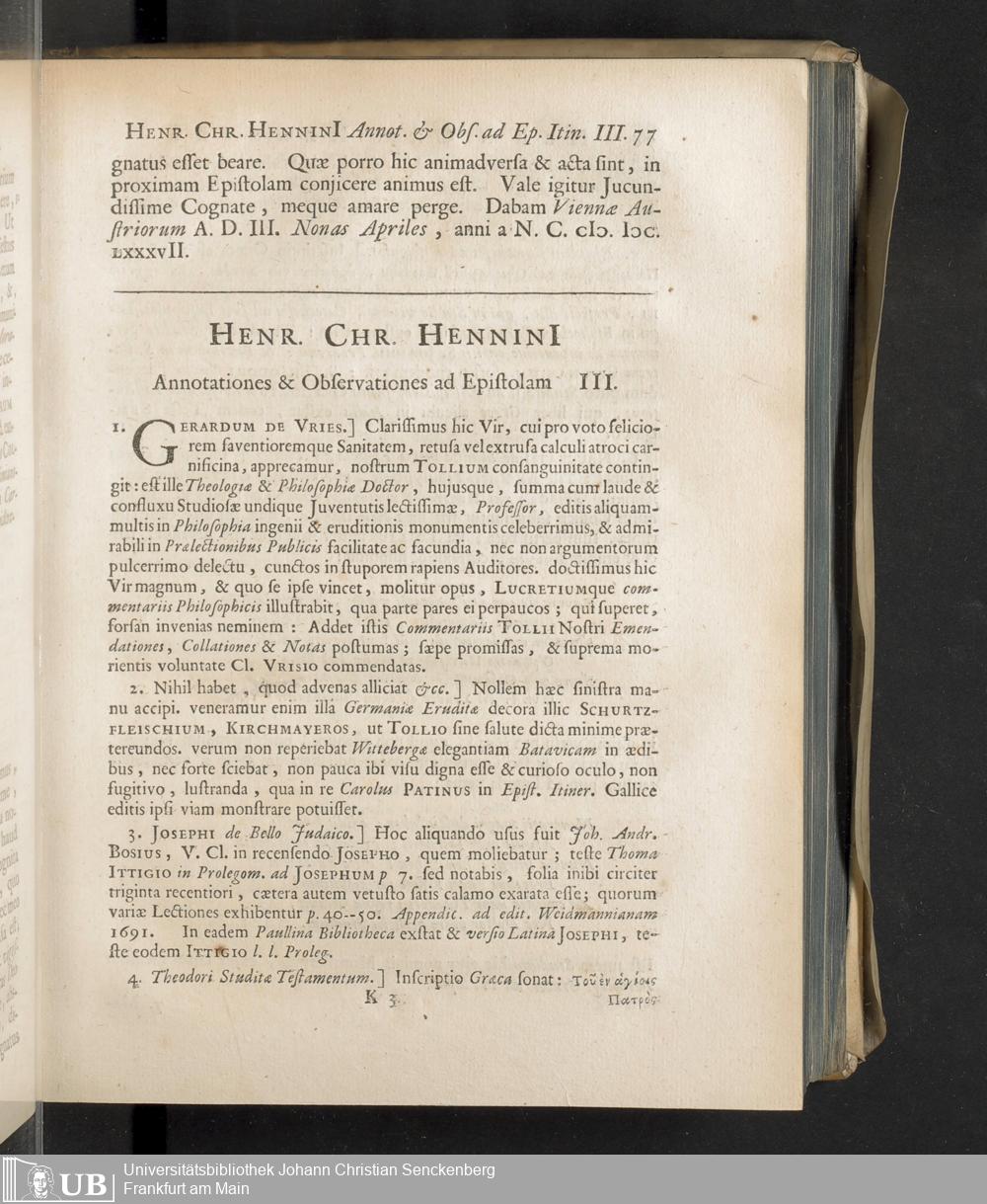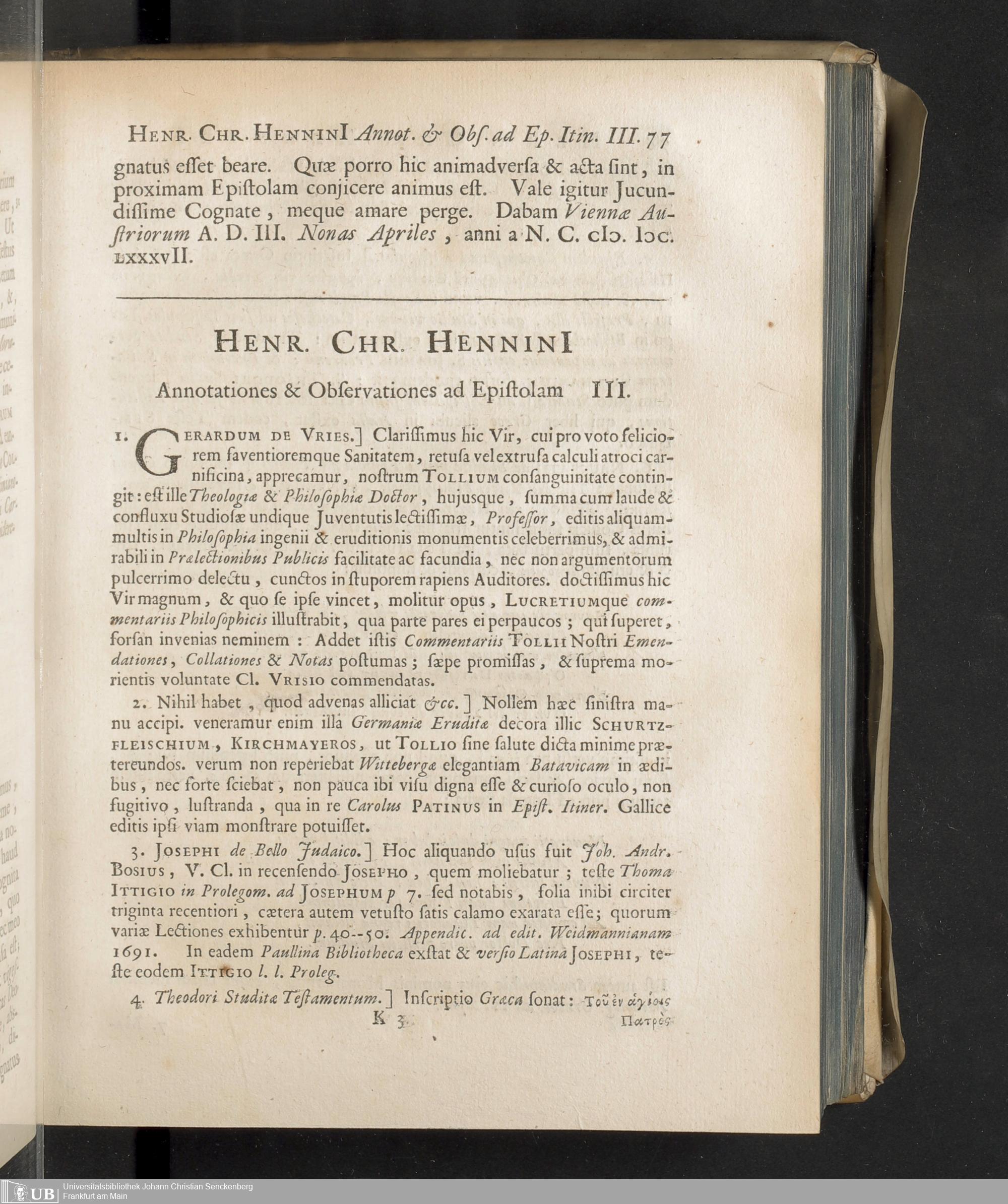 Jacobi Tollii Epistolae Itinerariae / ex Auctoris Schedis Postumis Recensitae, Suppletae, Digestae; Annotationibus, Observationibus & Figuris adornatae, cura & studio Henrici Christiani Henninii