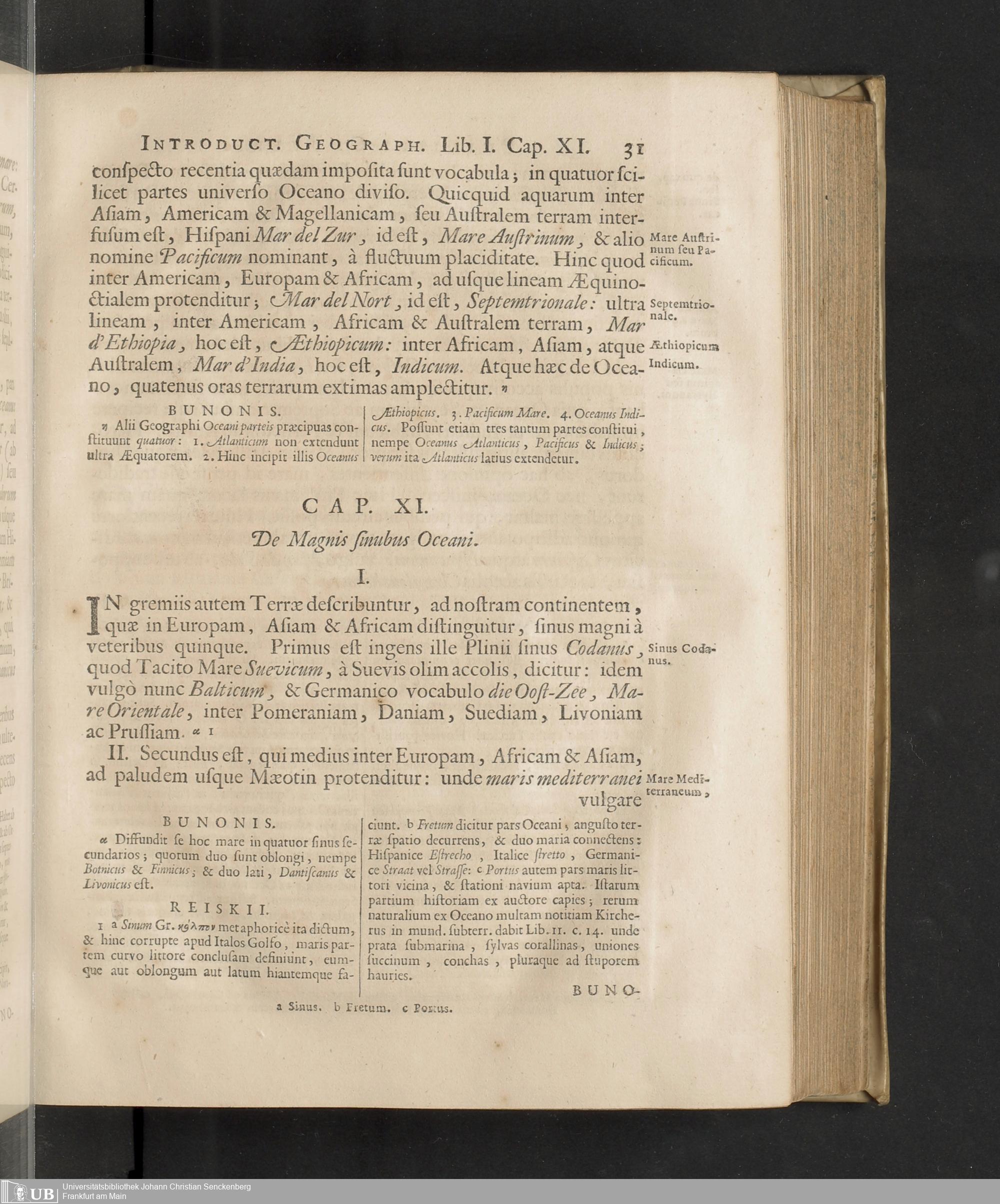 Philippi Cluverii Introductio In Universam Geographiam Tam veterem quam novam : Tabulis Geographicis XLVI. ac Notis olim ornata à Johanne Bunone, Jam verô locupletata Additamentis & Annotationibus Joh. Frid. Hekelii & Joh. Reiskii. Cum privilegio ordinum Holl. & Westfrisiæ