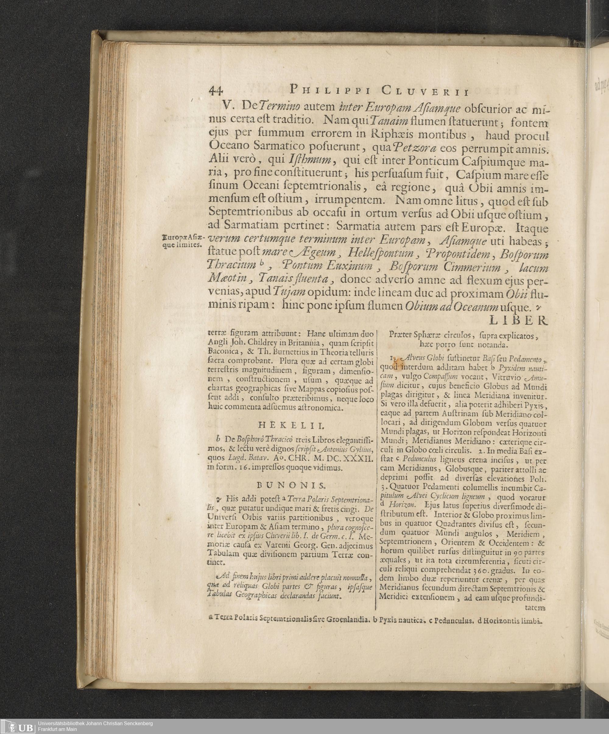 Philippi Cluverii Introductio In Universam Geographiam Tam veterem quam novam : Tabulis Geographicis XLVI. ac Notis olim ornata à Johanne Bunone, Jam verô locupletata Additamentis & Annotationibus Joh. Frid. Hekelii & Joh. Reiskii. Cum privilegio ordinum Holl. & Westfrisiæ