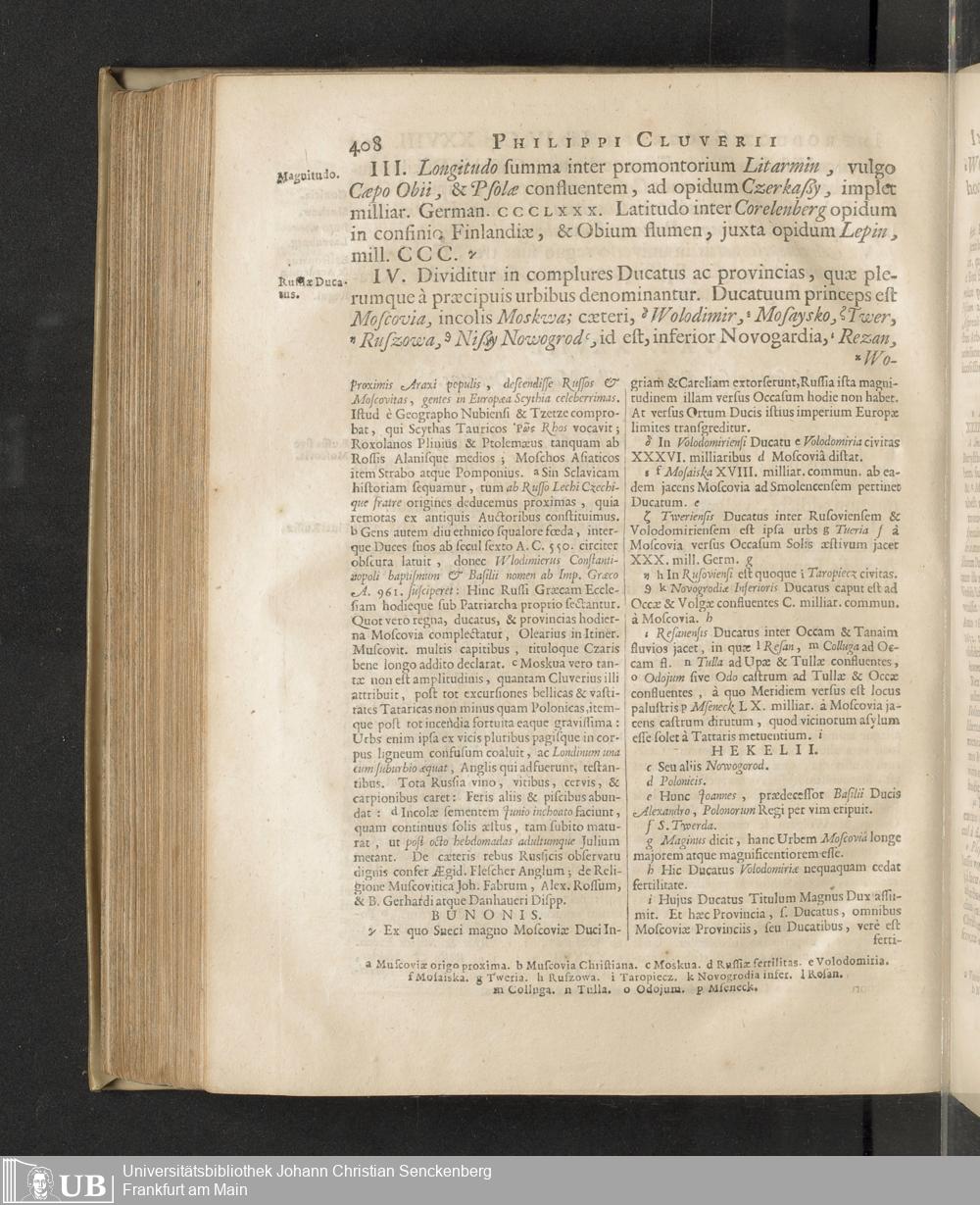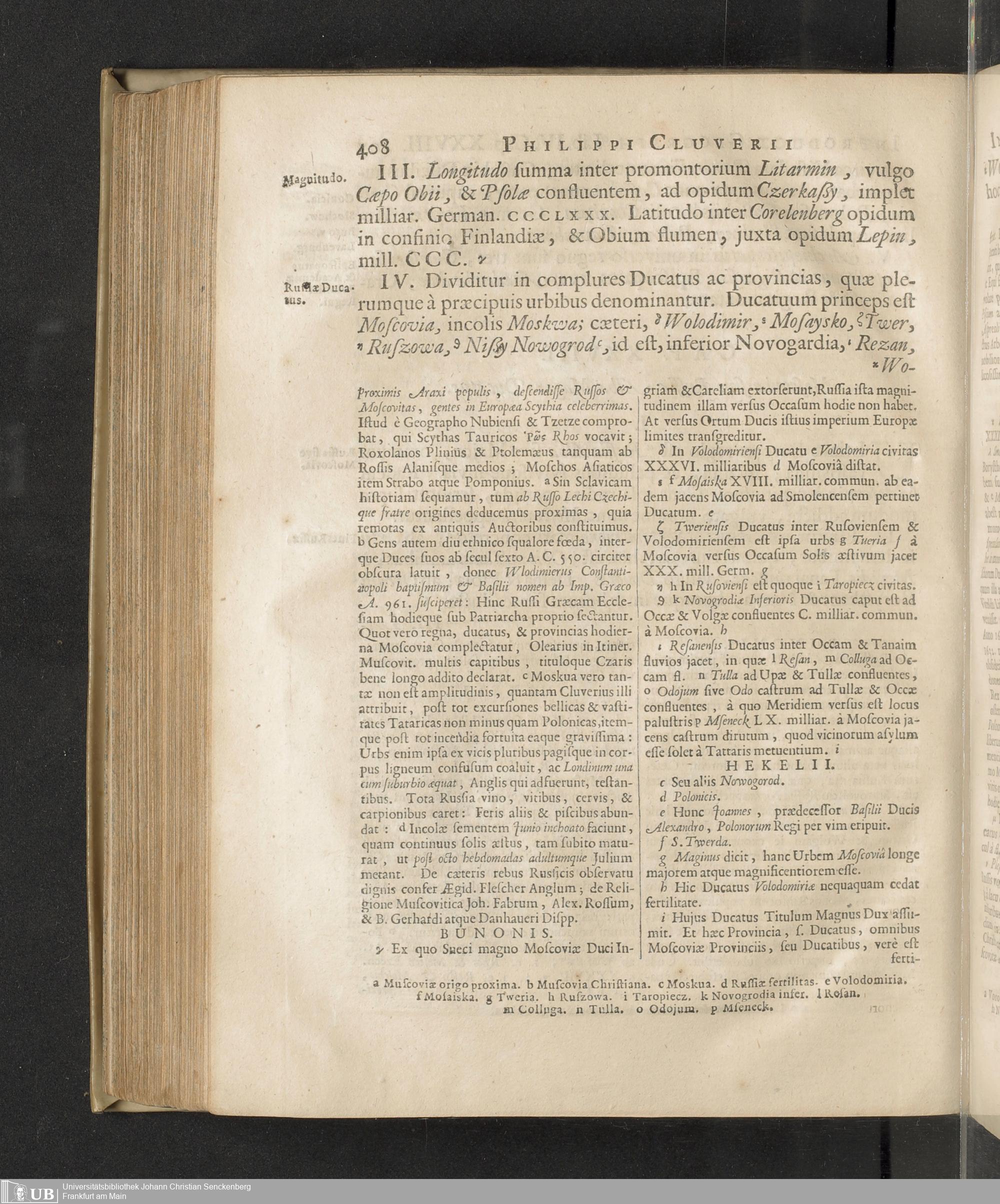 Philippi Cluverii Introductio In Universam Geographiam Tam veterem quam novam : Tabulis Geographicis XLVI. ac Notis olim ornata à Johanne Bunone, Jam verô locupletata Additamentis & Annotationibus Joh. Frid. Hekelii & Joh. Reiskii. Cum privilegio ordinum Holl. & Westfrisiæ
