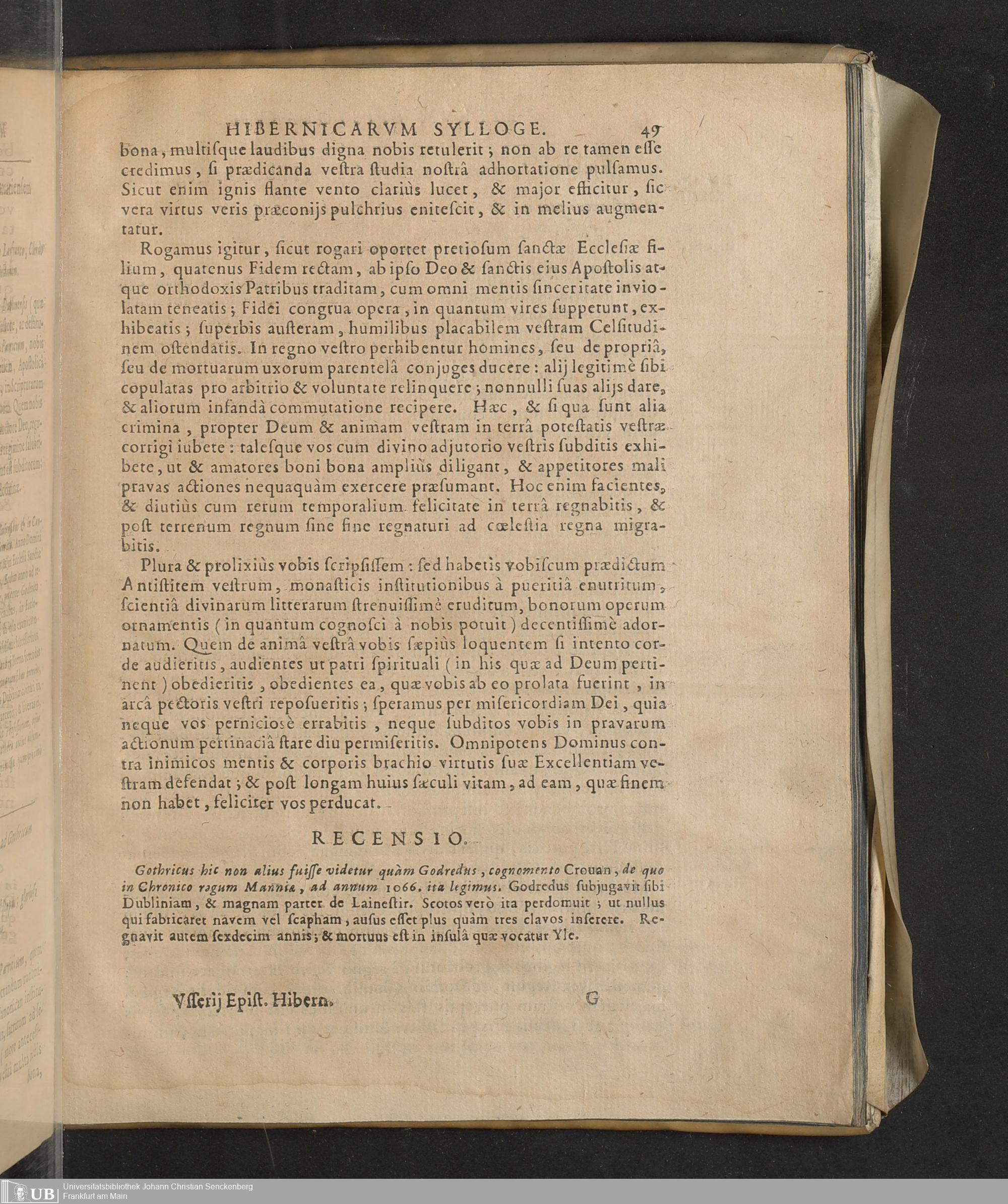 Vetervm Epistolarvm Hibernicarvm Sylloge : Quæ partim ab Hibernis, partim ad Hibernos ; partim de Hibernis vel rebus Hibernicis sunt conscriptæ [...] Epistolarum seriem proxima post præfationem pagina demonstrat / Iacobvs Vsserivs Archmachanvs Archiepiscopus Collegit & Recensuit