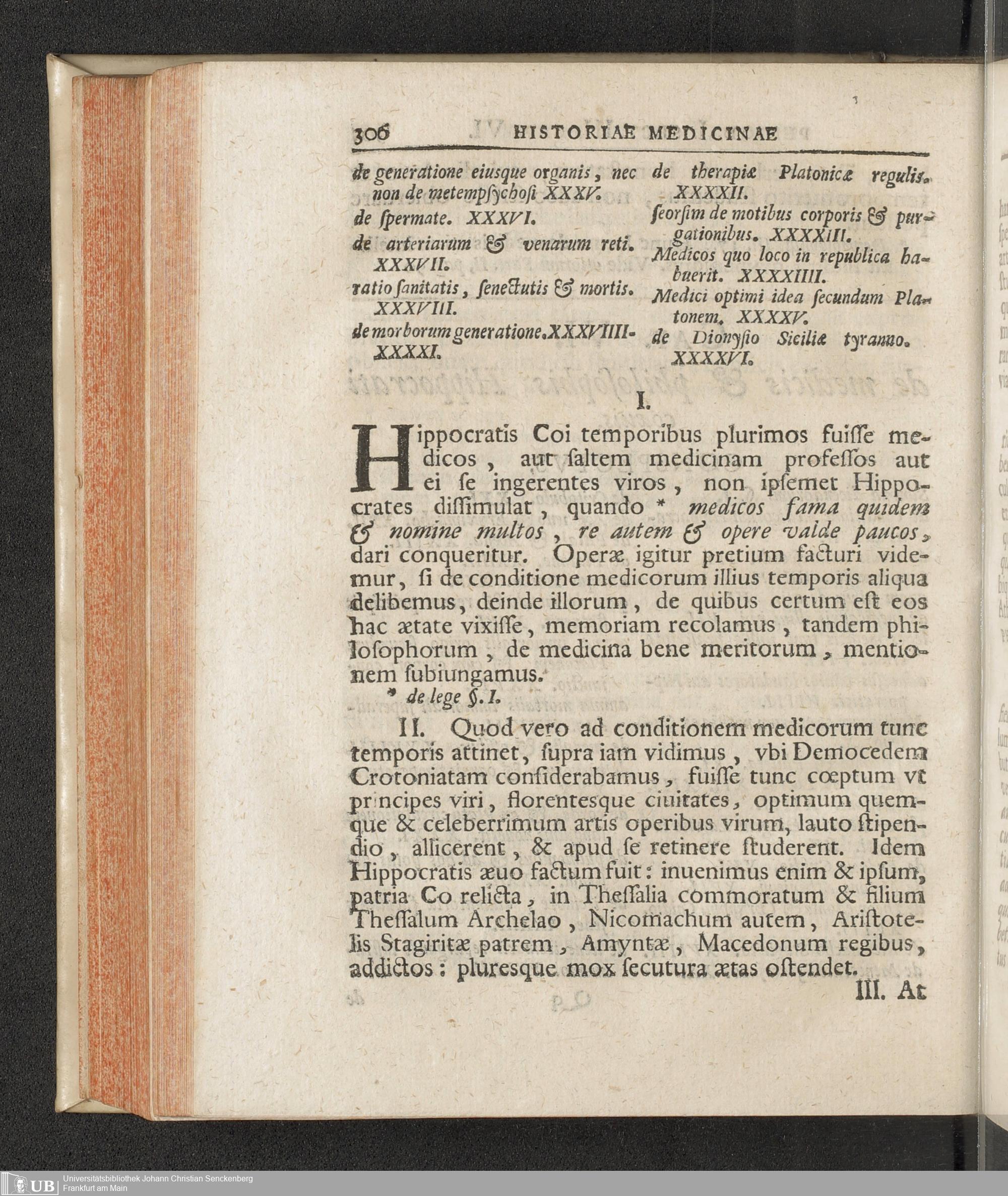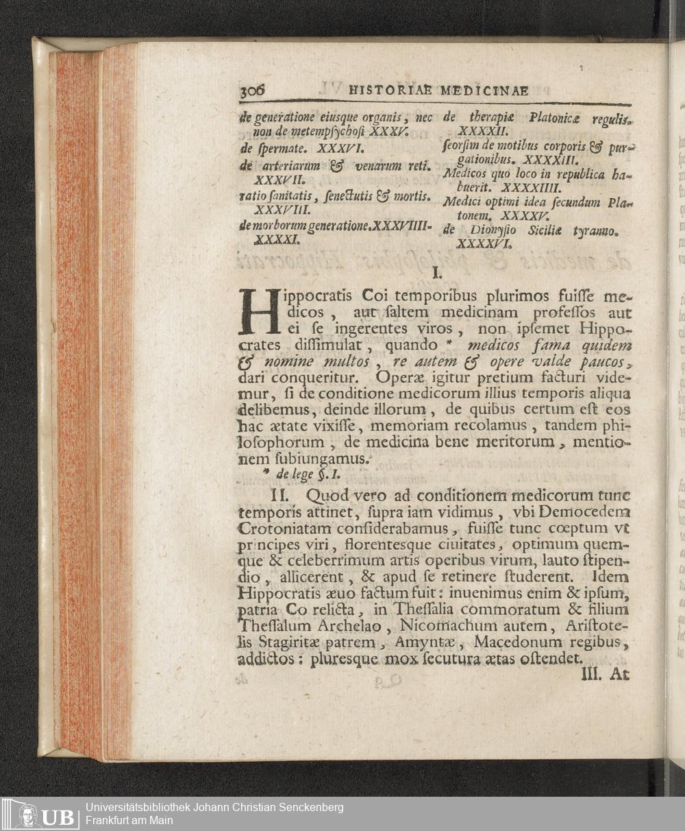 Historiae Medicinae Periodi Primae. Sectio Tertia de Hippocrate Coo Eiusque Vita et doctrinis deque Medicis Coaevis Coum. Cum Synchronismo Aliarum Gentium.