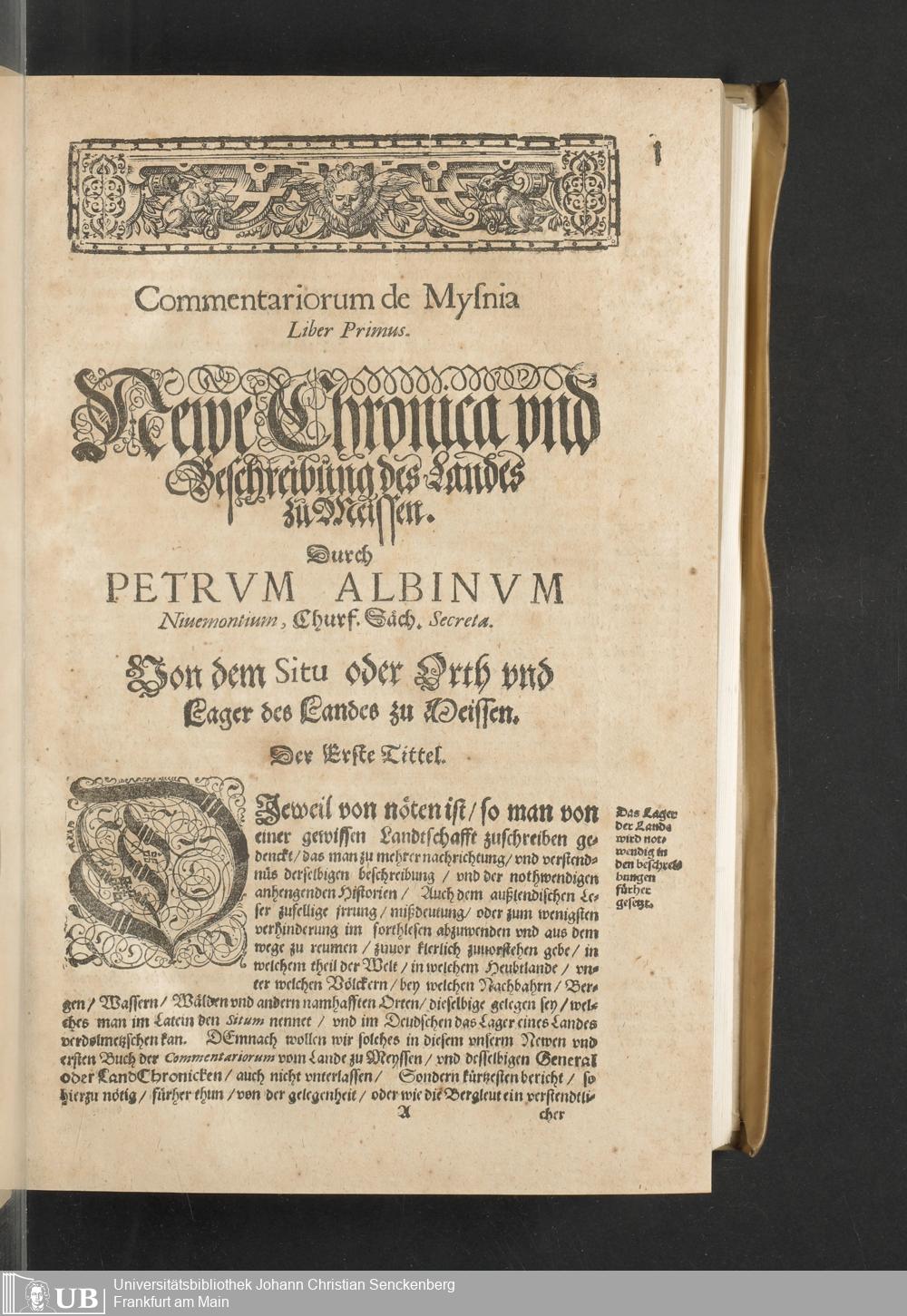 Meißnische Land vnd Berg-Chronica, : Jn welcher ein vollnstendige description des Landes, so zwischen der Elbe, Sala vnd Südödischen Behmischen gebirgen gelegen, So wol der dorinnen begriffenen auch anderer Bergwercken, sampt zugehörigen Metall vn[d] Metallar beschreibungen. : Mit einuorleibten fürnehmen Sächsischen, Düringischen vnd Meißninschen Historien. : Auch nicht wenig Tafeln, Wapen vnd Antiquiteten, derer etliche in Kupffer gestochen. / Gestellet durch Petrum Albinum M. Churf. Sech. Secr. ..