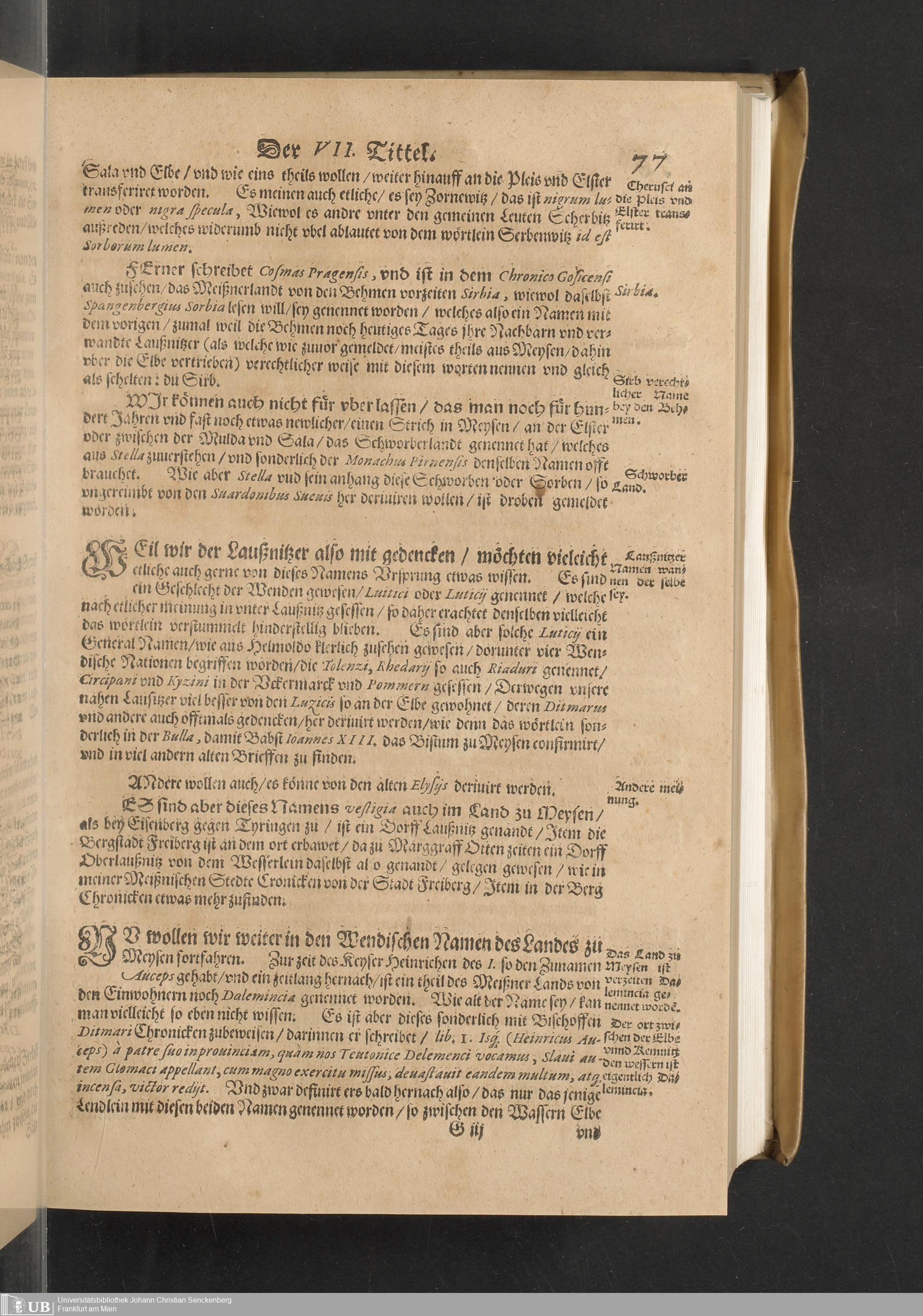 Meißnische Land vnd Berg-Chronica, : Jn welcher ein vollnstendige description des Landes, so zwischen der Elbe, Sala vnd Südödischen Behmischen gebirgen gelegen, So wol der dorinnen begriffenen auch anderer Bergwercken, sampt zugehörigen Metall vn[d] Metallar beschreibungen. : Mit einuorleibten fürnehmen Sächsischen, Düringischen vnd Meißninschen Historien. : Auch nicht wenig Tafeln, Wapen vnd Antiquiteten, derer etliche in Kupffer gestochen. / Gestellet durch Petrum Albinum M. Churf. Sech. Secr. ..