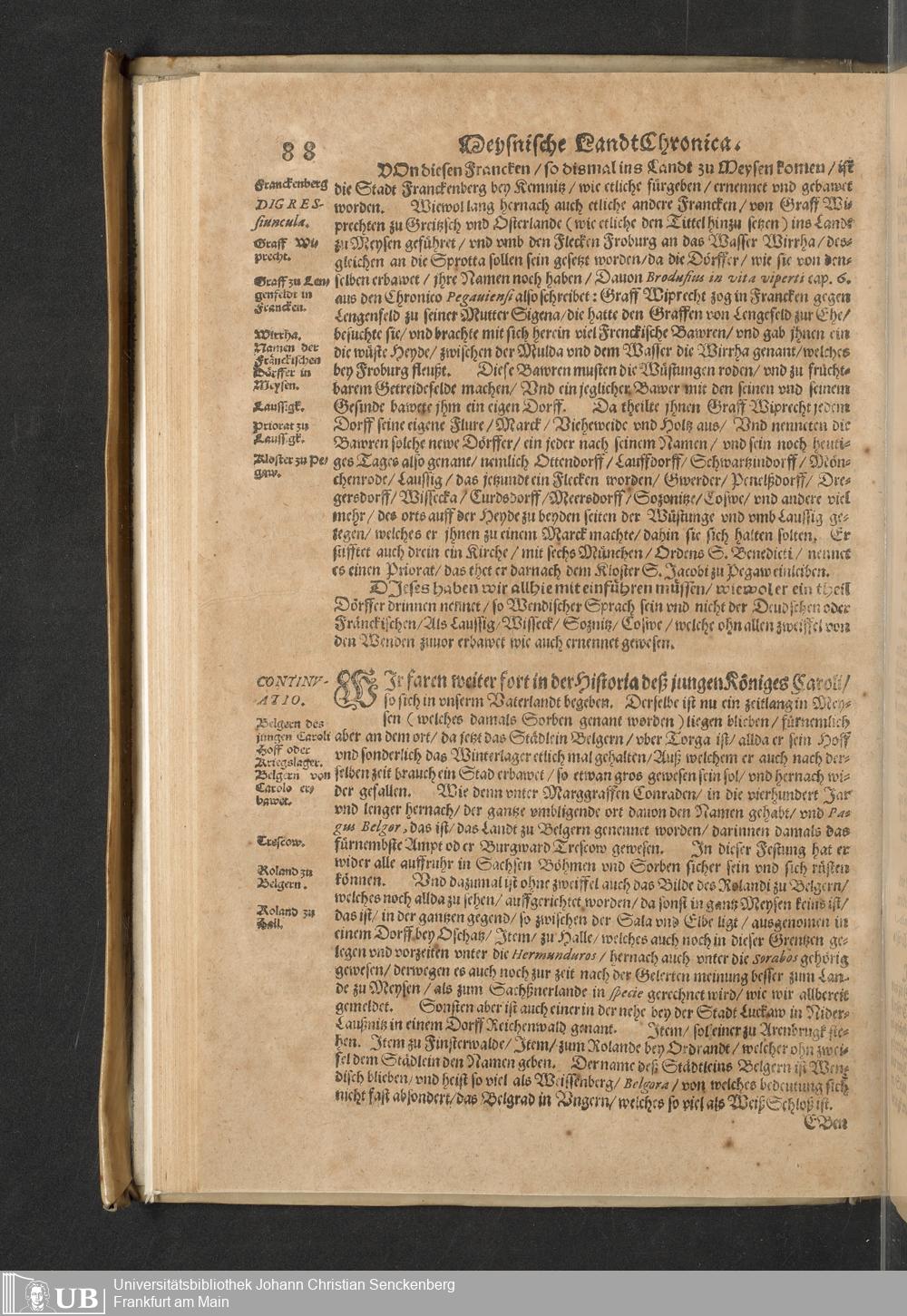 Meißnische Land vnd Berg-Chronica, : Jn welcher ein vollnstendige description des Landes, so zwischen der Elbe, Sala vnd Südödischen Behmischen gebirgen gelegen, So wol der dorinnen begriffenen auch anderer Bergwercken, sampt zugehörigen Metall vn[d] Metallar beschreibungen. : Mit einuorleibten fürnehmen Sächsischen, Düringischen vnd Meißninschen Historien. : Auch nicht wenig Tafeln, Wapen vnd Antiquiteten, derer etliche in Kupffer gestochen. / Gestellet durch Petrum Albinum M. Churf. Sech. Secr. ..