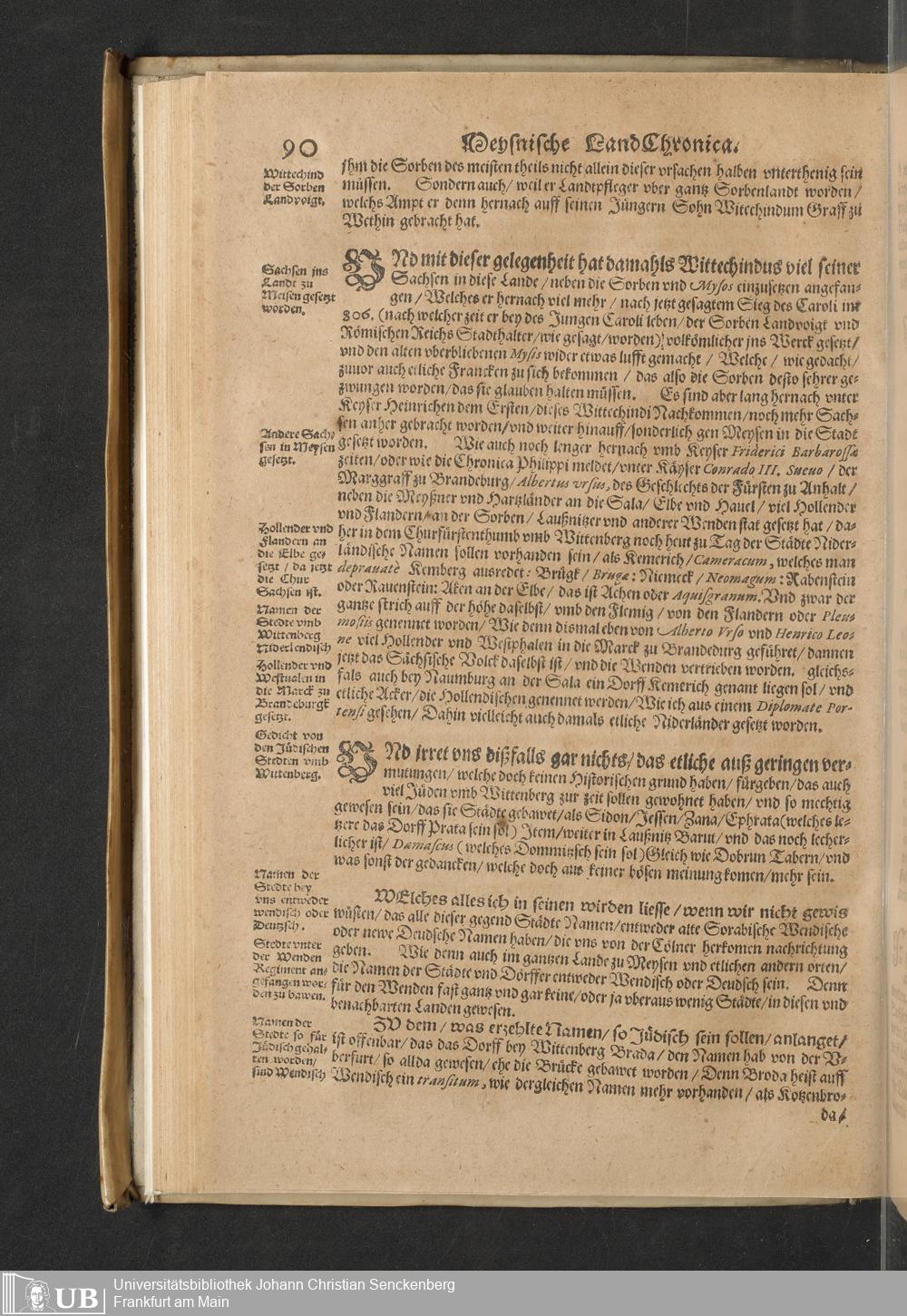 Meißnische Land vnd Berg-Chronica, : Jn welcher ein vollnstendige description des Landes, so zwischen der Elbe, Sala vnd Südödischen Behmischen gebirgen gelegen, So wol der dorinnen begriffenen auch anderer Bergwercken, sampt zugehörigen Metall vn[d] Metallar beschreibungen. : Mit einuorleibten fürnehmen Sächsischen, Düringischen vnd Meißninschen Historien. : Auch nicht wenig Tafeln, Wapen vnd Antiquiteten, derer etliche in Kupffer gestochen. / Gestellet durch Petrum Albinum M. Churf. Sech. Secr. ..