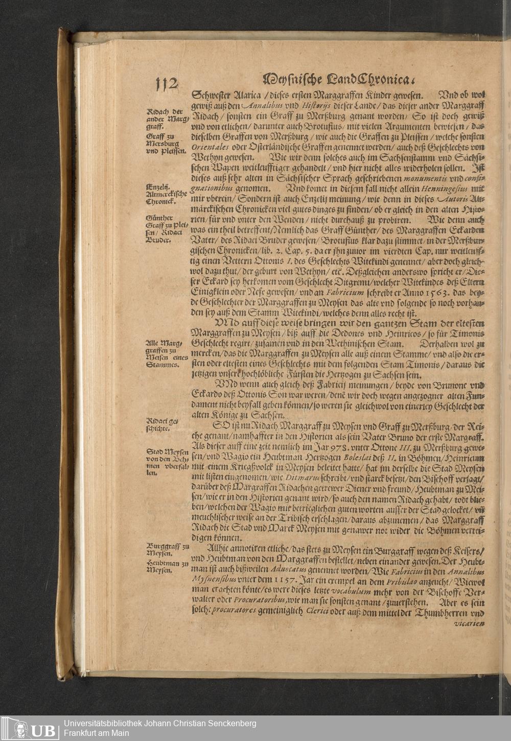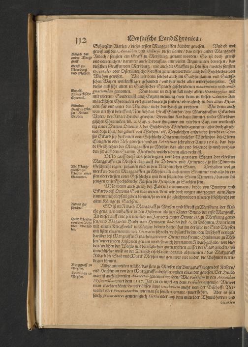Meißnische Land vnd Berg-Chronica, : Jn welcher ein vollnstendige description des Landes, so zwischen der Elbe, Sala vnd Südödischen Behmischen gebirgen gelegen, So wol der dorinnen begriffenen auch anderer Bergwercken, sampt zugehörigen Metall vn[d] Metallar beschreibungen. : Mit einuorleibten fürnehmen Sächsischen, Düringischen vnd Meißninschen Historien. : Auch nicht wenig Tafeln, Wapen vnd Antiquiteten, derer etliche in Kupffer gestochen. / Gestellet durch Petrum Albinum M. Churf. Sech. Secr. ..