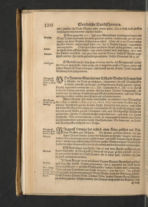Meißnische Land vnd Berg-Chronica, : Jn welcher ein vollnstendige description des Landes, so zwischen der Elbe, Sala vnd Südödischen Behmischen gebirgen gelegen, So wol der dorinnen begriffenen auch anderer Bergwercken, sampt zugehörigen Metall vn[d] Metallar beschreibungen. : Mit einuorleibten fürnehmen Sächsischen, Düringischen vnd Meißninschen Historien. : Auch nicht wenig Tafeln, Wapen vnd Antiquiteten, derer etliche in Kupffer gestochen. / Gestellet durch Petrum Albinum M. Churf. Sech. Secr. ..