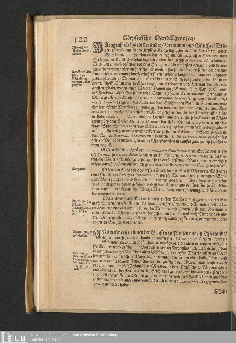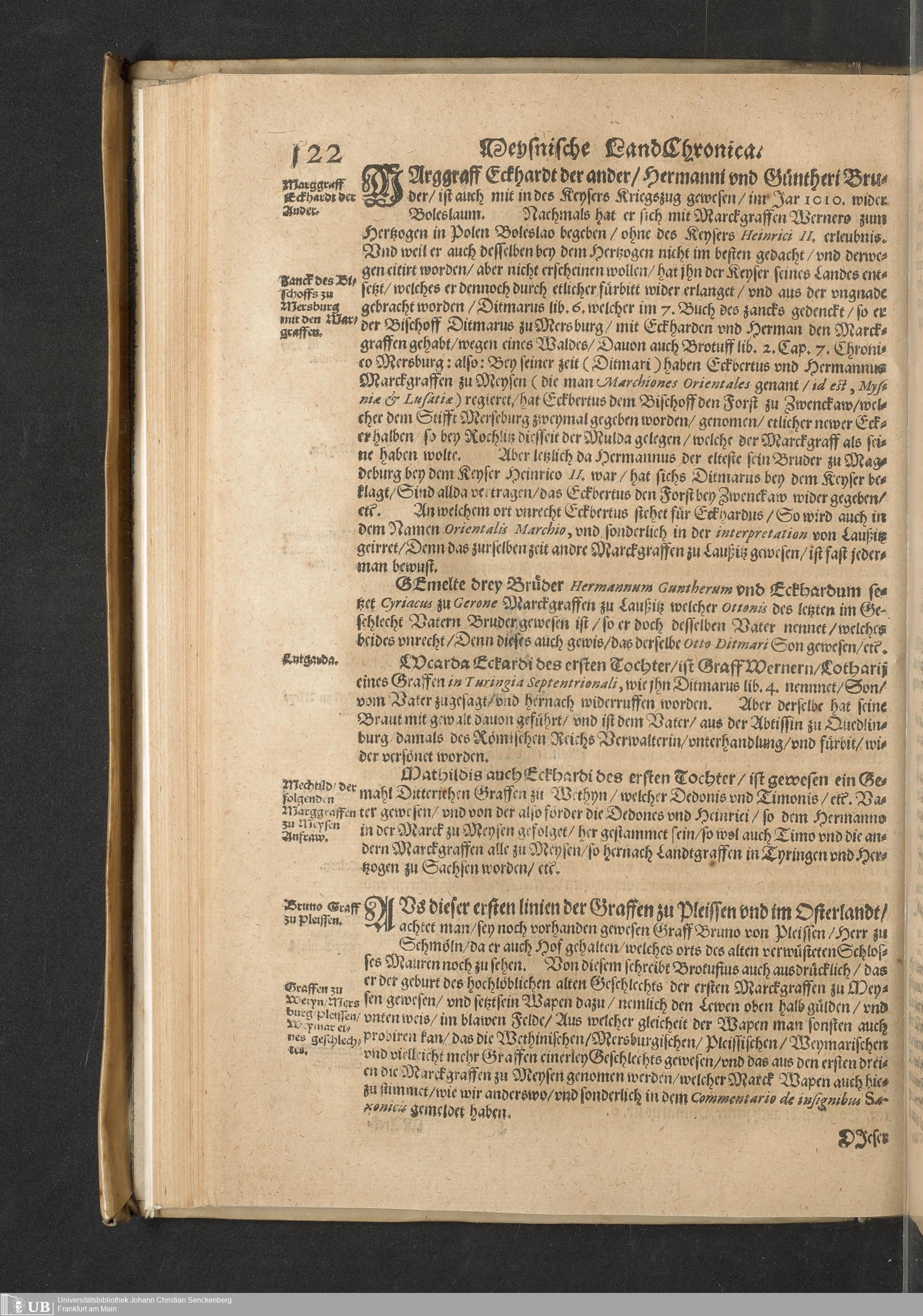 Meißnische Land vnd Berg-Chronica, : Jn welcher ein vollnstendige description des Landes, so zwischen der Elbe, Sala vnd Südödischen Behmischen gebirgen gelegen, So wol der dorinnen begriffenen auch anderer Bergwercken, sampt zugehörigen Metall vn[d] Metallar beschreibungen. : Mit einuorleibten fürnehmen Sächsischen, Düringischen vnd Meißninschen Historien. : Auch nicht wenig Tafeln, Wapen vnd Antiquiteten, derer etliche in Kupffer gestochen. / Gestellet durch Petrum Albinum M. Churf. Sech. Secr. ..