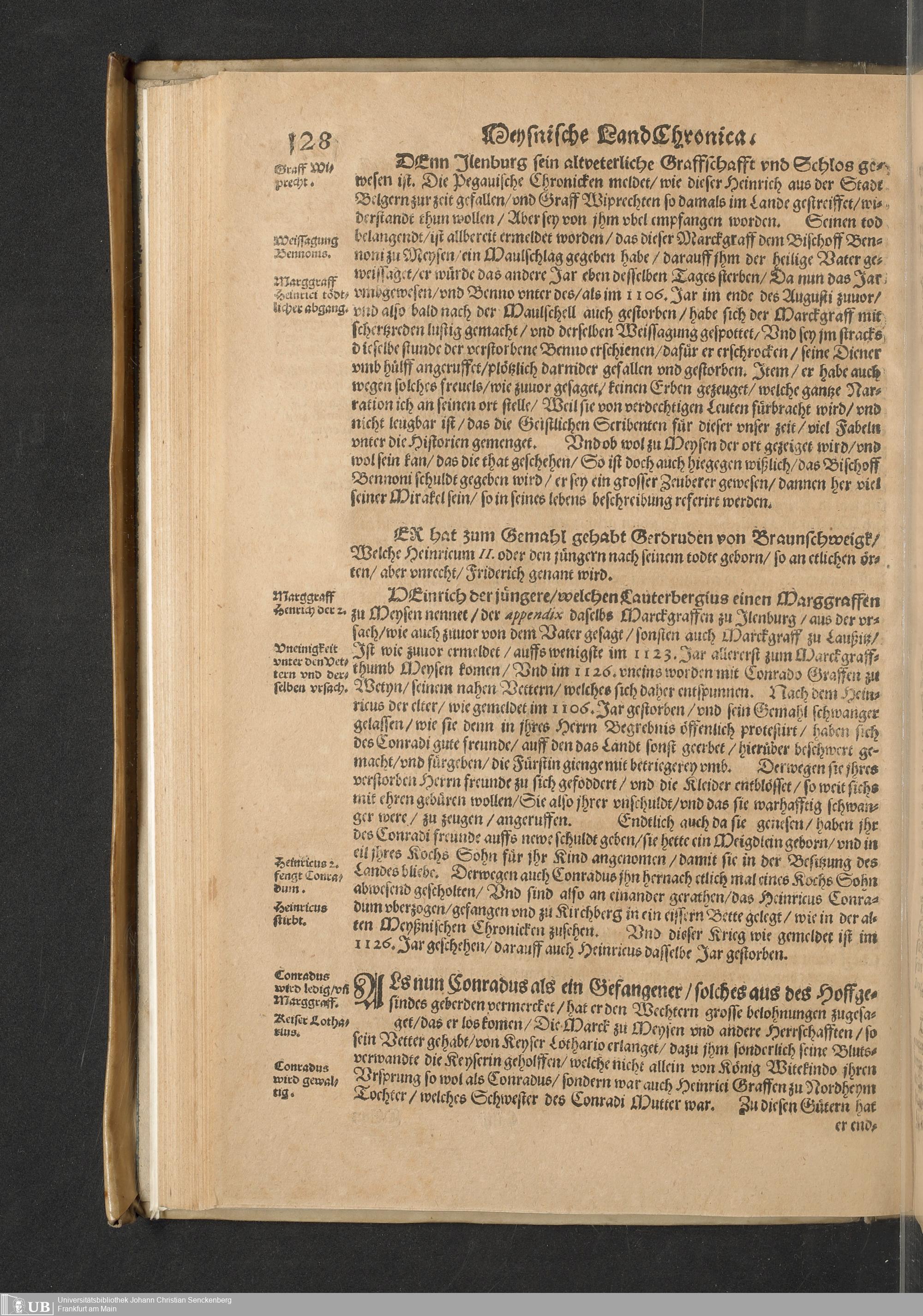 Meißnische Land vnd Berg-Chronica, : Jn welcher ein vollnstendige description des Landes, so zwischen der Elbe, Sala vnd Südödischen Behmischen gebirgen gelegen, So wol der dorinnen begriffenen auch anderer Bergwercken, sampt zugehörigen Metall vn[d] Metallar beschreibungen. : Mit einuorleibten fürnehmen Sächsischen, Düringischen vnd Meißninschen Historien. : Auch nicht wenig Tafeln, Wapen vnd Antiquiteten, derer etliche in Kupffer gestochen. / Gestellet durch Petrum Albinum M. Churf. Sech. Secr. ..