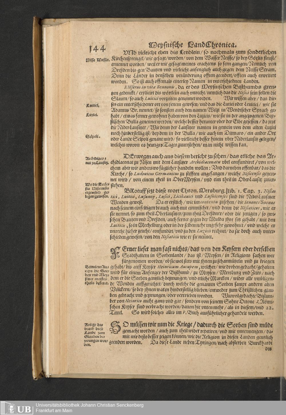Meißnische Land vnd Berg-Chronica, : Jn welcher ein vollnstendige description des Landes, so zwischen der Elbe, Sala vnd Südödischen Behmischen gebirgen gelegen, So wol der dorinnen begriffenen auch anderer Bergwercken, sampt zugehörigen Metall vn[d] Metallar beschreibungen. : Mit einuorleibten fürnehmen Sächsischen, Düringischen vnd Meißninschen Historien. : Auch nicht wenig Tafeln, Wapen vnd Antiquiteten, derer etliche in Kupffer gestochen. / Gestellet durch Petrum Albinum M. Churf. Sech. Secr. ..