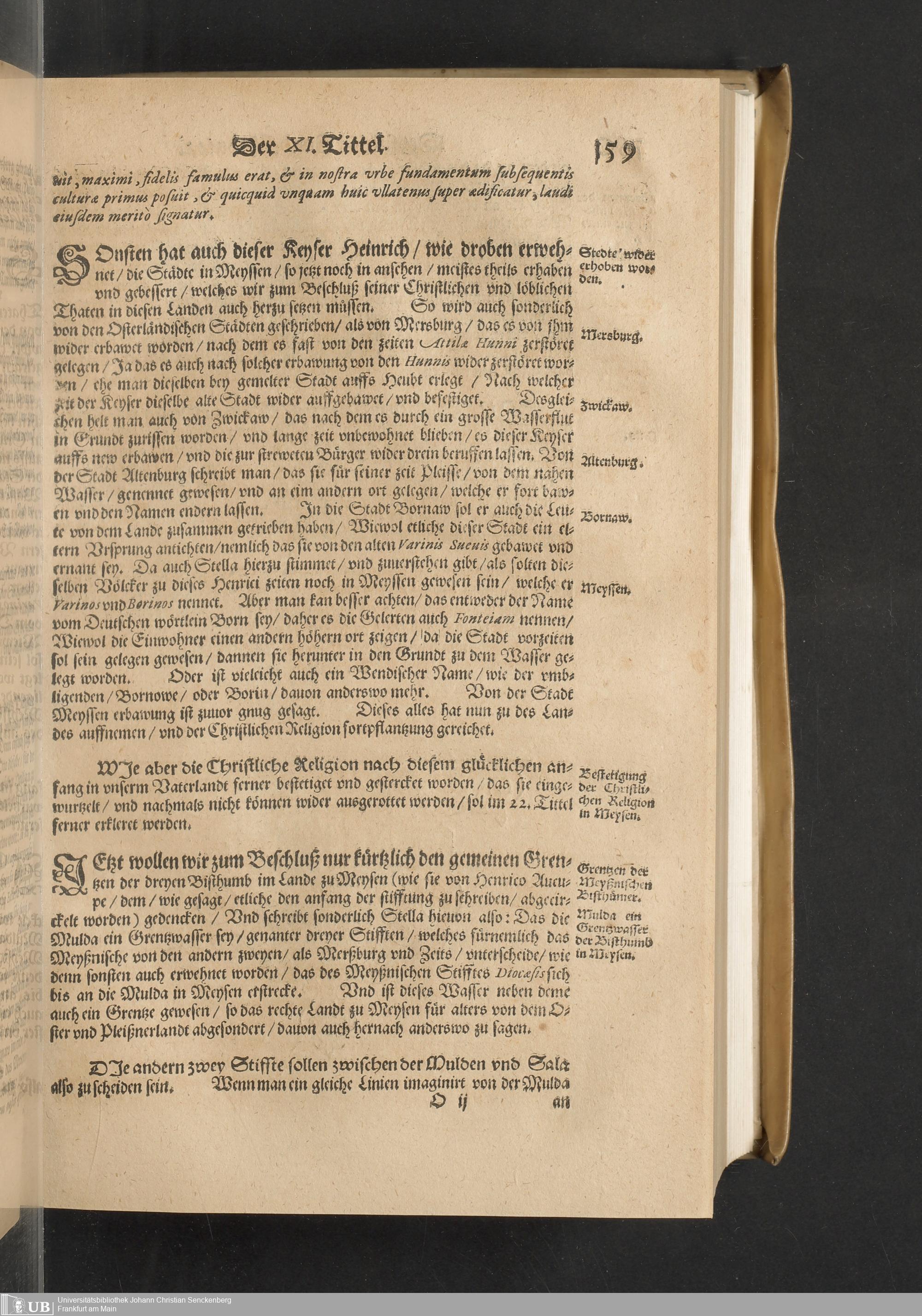 Meißnische Land vnd Berg-Chronica, : Jn welcher ein vollnstendige description des Landes, so zwischen der Elbe, Sala vnd Südödischen Behmischen gebirgen gelegen, So wol der dorinnen begriffenen auch anderer Bergwercken, sampt zugehörigen Metall vn[d] Metallar beschreibungen. : Mit einuorleibten fürnehmen Sächsischen, Düringischen vnd Meißninschen Historien. : Auch nicht wenig Tafeln, Wapen vnd Antiquiteten, derer etliche in Kupffer gestochen. / Gestellet durch Petrum Albinum M. Churf. Sech. Secr. ..