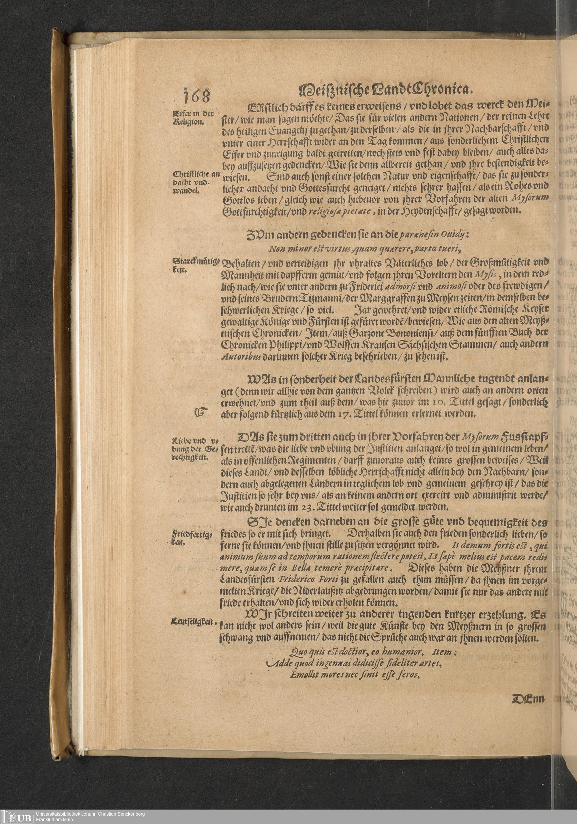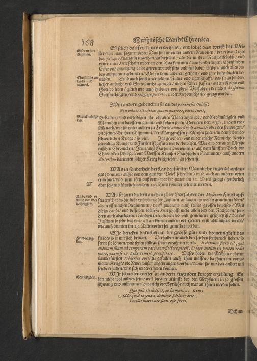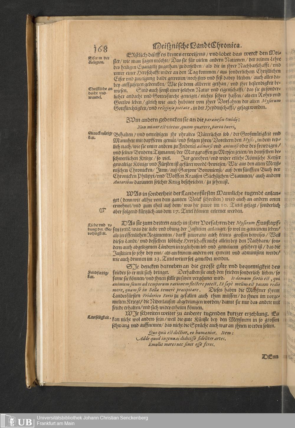 Meißnische Land vnd Berg-Chronica, : Jn welcher ein vollnstendige description des Landes, so zwischen der Elbe, Sala vnd Südödischen Behmischen gebirgen gelegen, So wol der dorinnen begriffenen auch anderer Bergwercken, sampt zugehörigen Metall vn[d] Metallar beschreibungen. : Mit einuorleibten fürnehmen Sächsischen, Düringischen vnd Meißninschen Historien. : Auch nicht wenig Tafeln, Wapen vnd Antiquiteten, derer etliche in Kupffer gestochen. / Gestellet durch Petrum Albinum M. Churf. Sech. Secr. ..