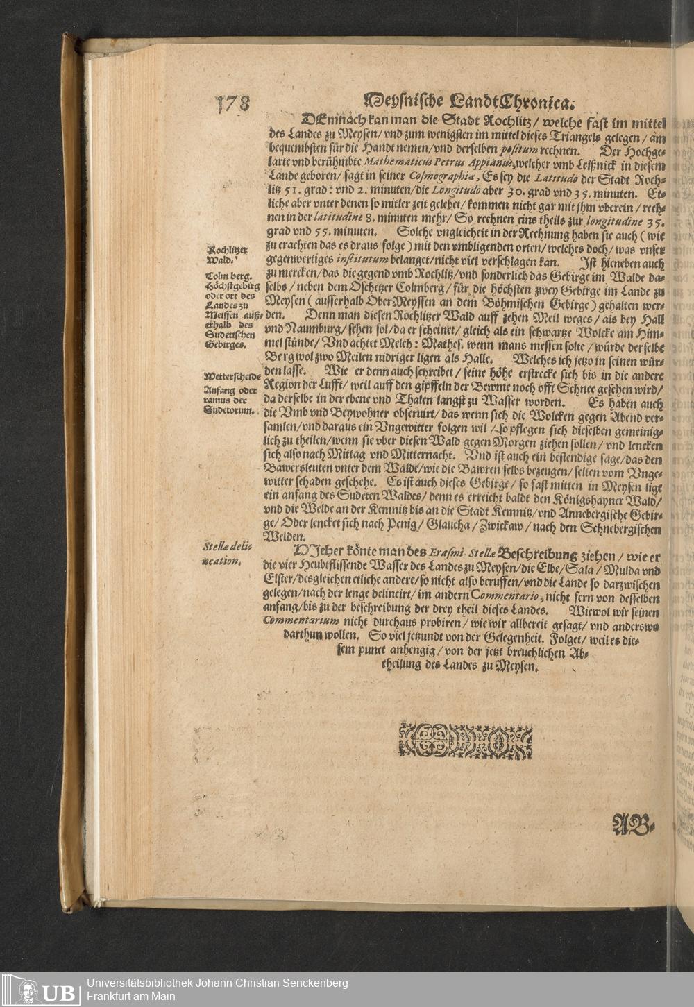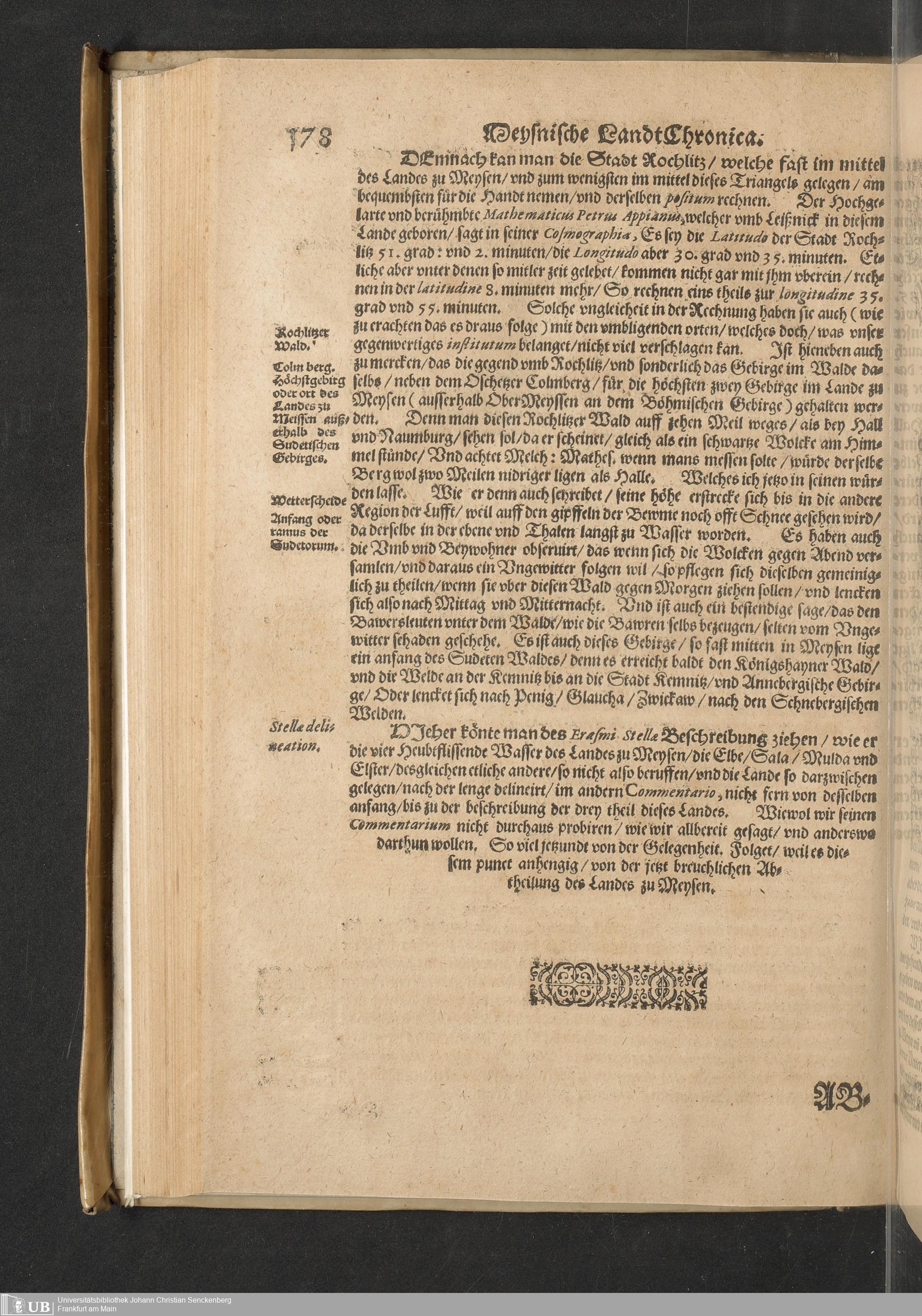 Meißnische Land vnd Berg-Chronica, : Jn welcher ein vollnstendige description des Landes, so zwischen der Elbe, Sala vnd Südödischen Behmischen gebirgen gelegen, So wol der dorinnen begriffenen auch anderer Bergwercken, sampt zugehörigen Metall vn[d] Metallar beschreibungen. : Mit einuorleibten fürnehmen Sächsischen, Düringischen vnd Meißninschen Historien. : Auch nicht wenig Tafeln, Wapen vnd Antiquiteten, derer etliche in Kupffer gestochen. / Gestellet durch Petrum Albinum M. Churf. Sech. Secr. ..