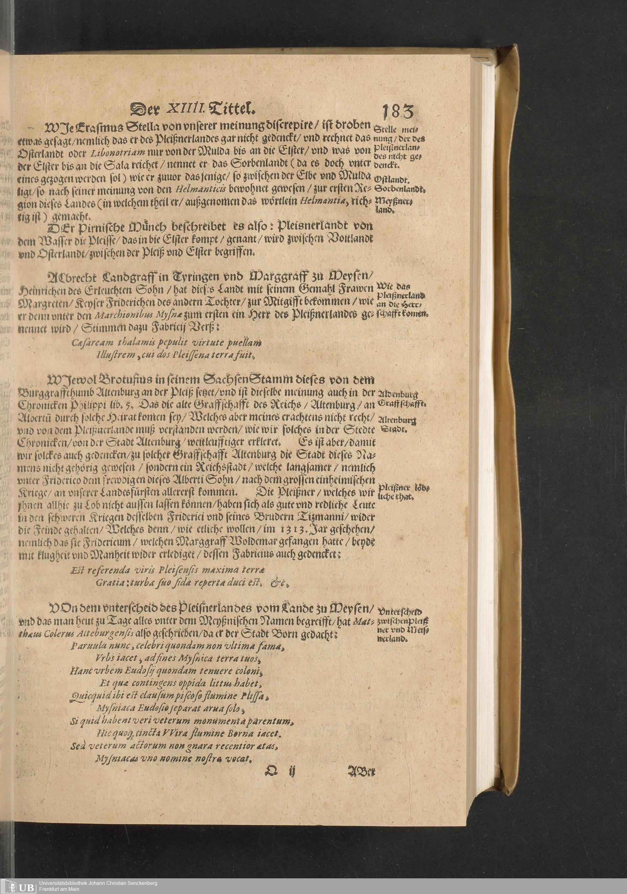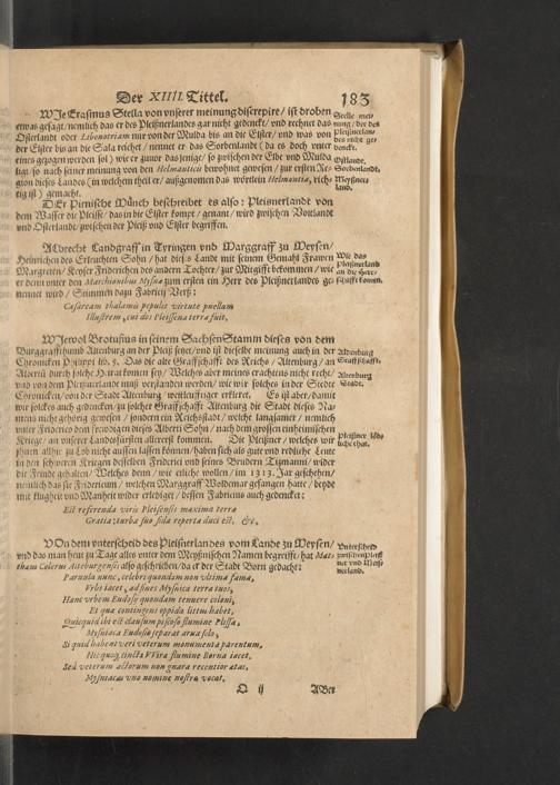 Meißnische Land vnd Berg-Chronica, : Jn welcher ein vollnstendige description des Landes, so zwischen der Elbe, Sala vnd Südödischen Behmischen gebirgen gelegen, So wol der dorinnen begriffenen auch anderer Bergwercken, sampt zugehörigen Metall vn[d] Metallar beschreibungen. : Mit einuorleibten fürnehmen Sächsischen, Düringischen vnd Meißninschen Historien. : Auch nicht wenig Tafeln, Wapen vnd Antiquiteten, derer etliche in Kupffer gestochen. / Gestellet durch Petrum Albinum M. Churf. Sech. Secr. ..