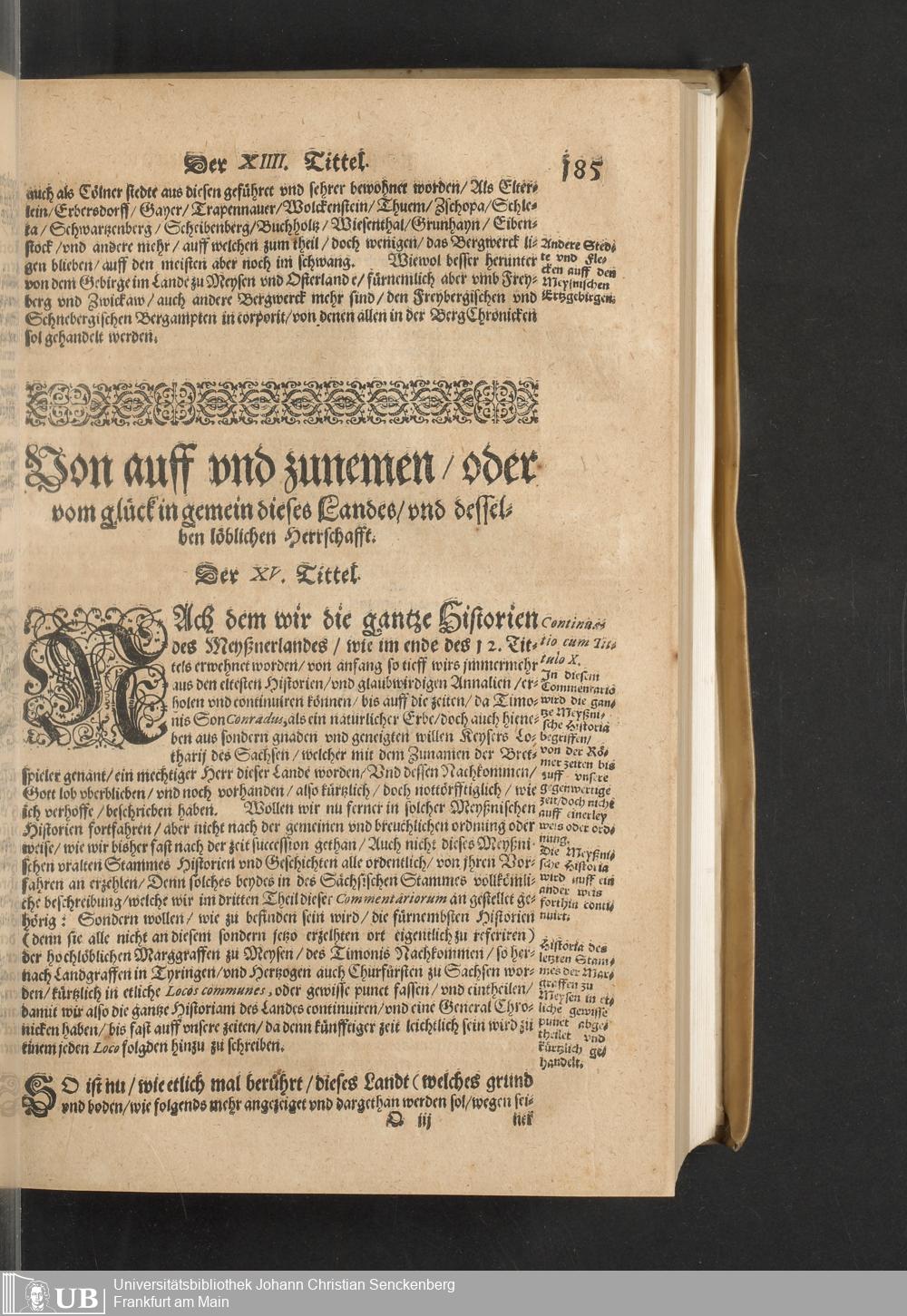 Meißnische Land vnd Berg-Chronica, : Jn welcher ein vollnstendige description des Landes, so zwischen der Elbe, Sala vnd Südödischen Behmischen gebirgen gelegen, So wol der dorinnen begriffenen auch anderer Bergwercken, sampt zugehörigen Metall vn[d] Metallar beschreibungen. : Mit einuorleibten fürnehmen Sächsischen, Düringischen vnd Meißninschen Historien. : Auch nicht wenig Tafeln, Wapen vnd Antiquiteten, derer etliche in Kupffer gestochen. / Gestellet durch Petrum Albinum M. Churf. Sech. Secr. ..
