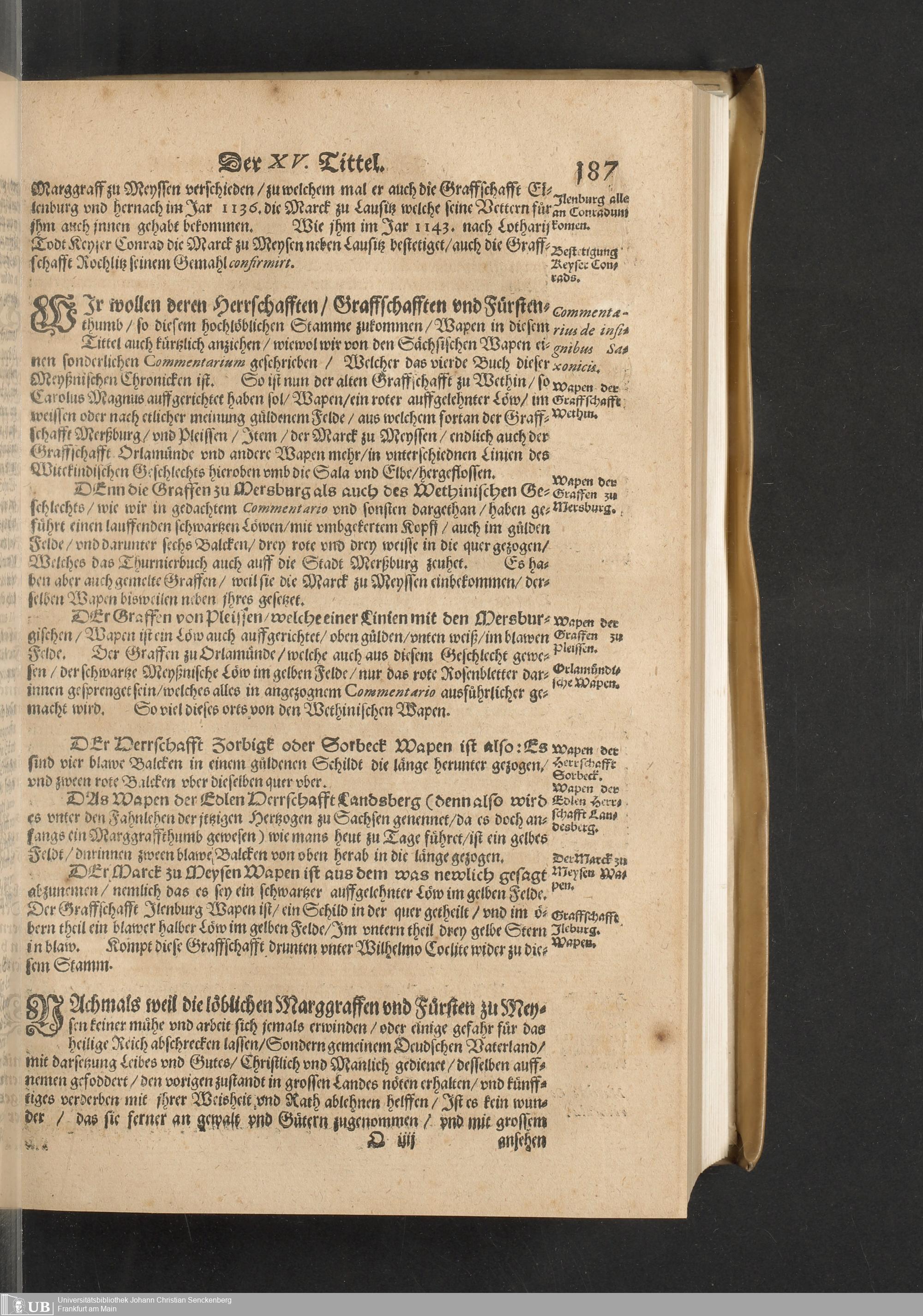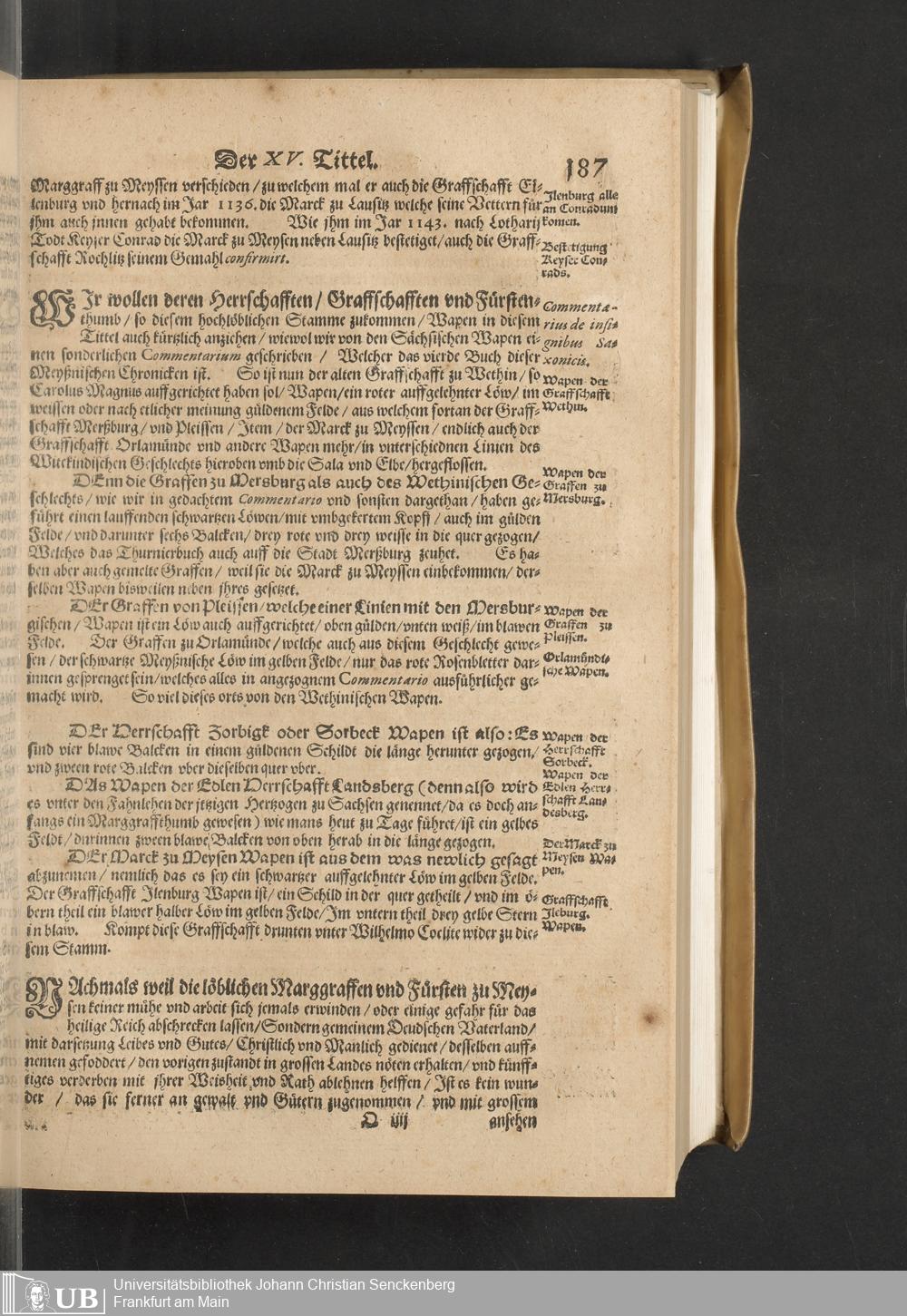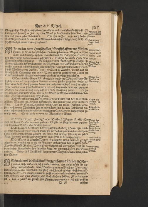 Meißnische Land vnd Berg-Chronica, : Jn welcher ein vollnstendige description des Landes, so zwischen der Elbe, Sala vnd Südödischen Behmischen gebirgen gelegen, So wol der dorinnen begriffenen auch anderer Bergwercken, sampt zugehörigen Metall vn[d] Metallar beschreibungen. : Mit einuorleibten fürnehmen Sächsischen, Düringischen vnd Meißninschen Historien. : Auch nicht wenig Tafeln, Wapen vnd Antiquiteten, derer etliche in Kupffer gestochen. / Gestellet durch Petrum Albinum M. Churf. Sech. Secr. ..