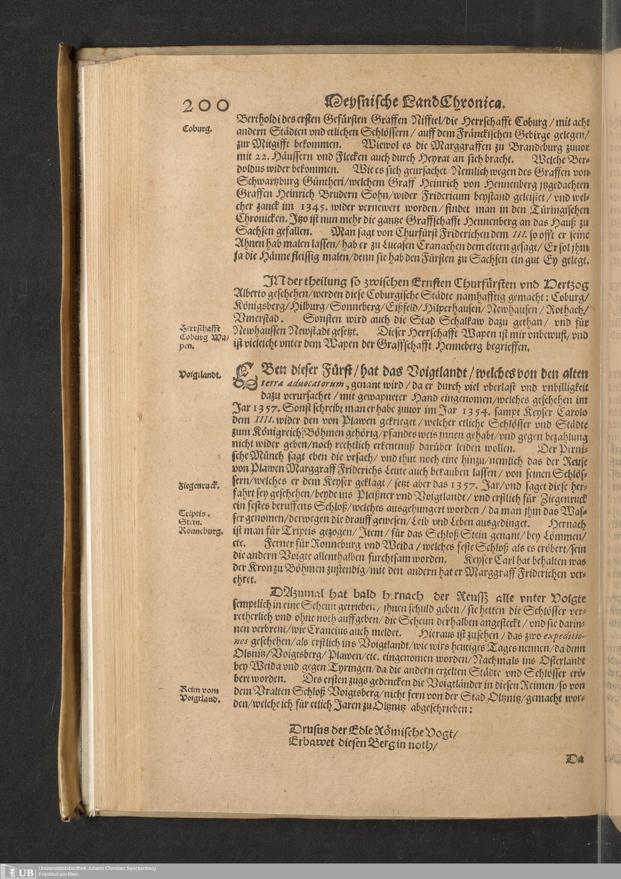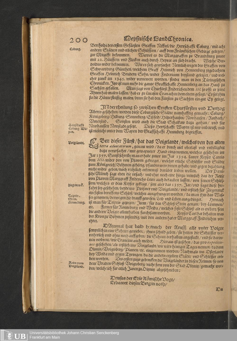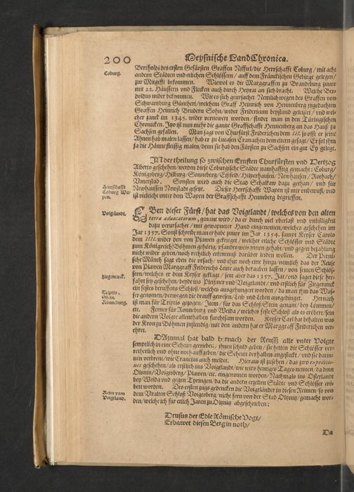 Meißnische Land vnd Berg-Chronica, : Jn welcher ein vollnstendige description des Landes, so zwischen der Elbe, Sala vnd Südödischen Behmischen gebirgen gelegen, So wol der dorinnen begriffenen auch anderer Bergwercken, sampt zugehörigen Metall vn[d] Metallar beschreibungen. : Mit einuorleibten fürnehmen Sächsischen, Düringischen vnd Meißninschen Historien. : Auch nicht wenig Tafeln, Wapen vnd Antiquiteten, derer etliche in Kupffer gestochen. / Gestellet durch Petrum Albinum M. Churf. Sech. Secr. ..