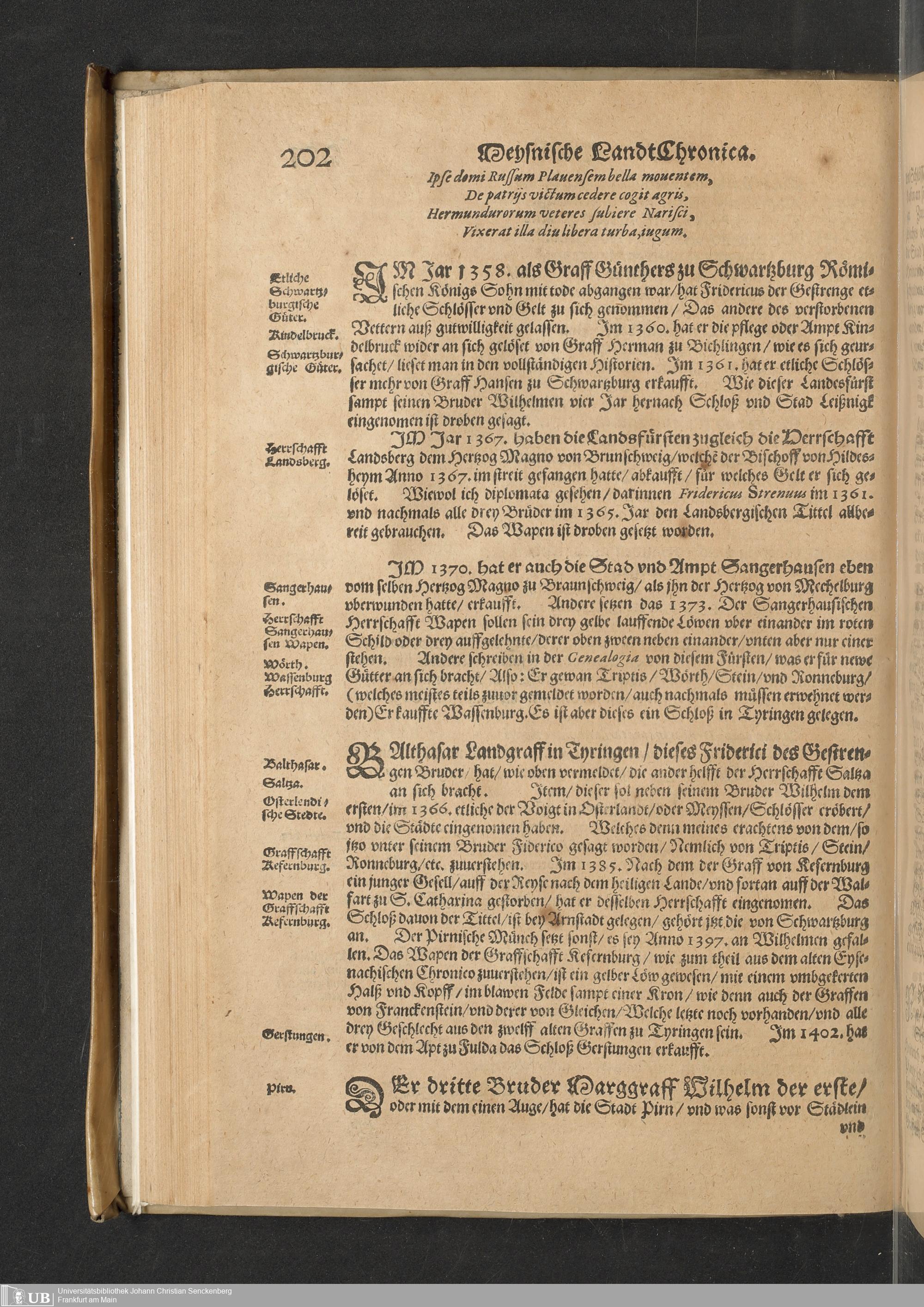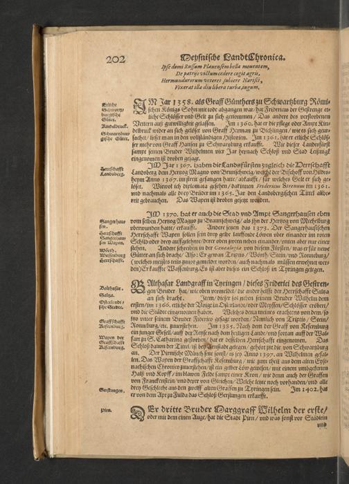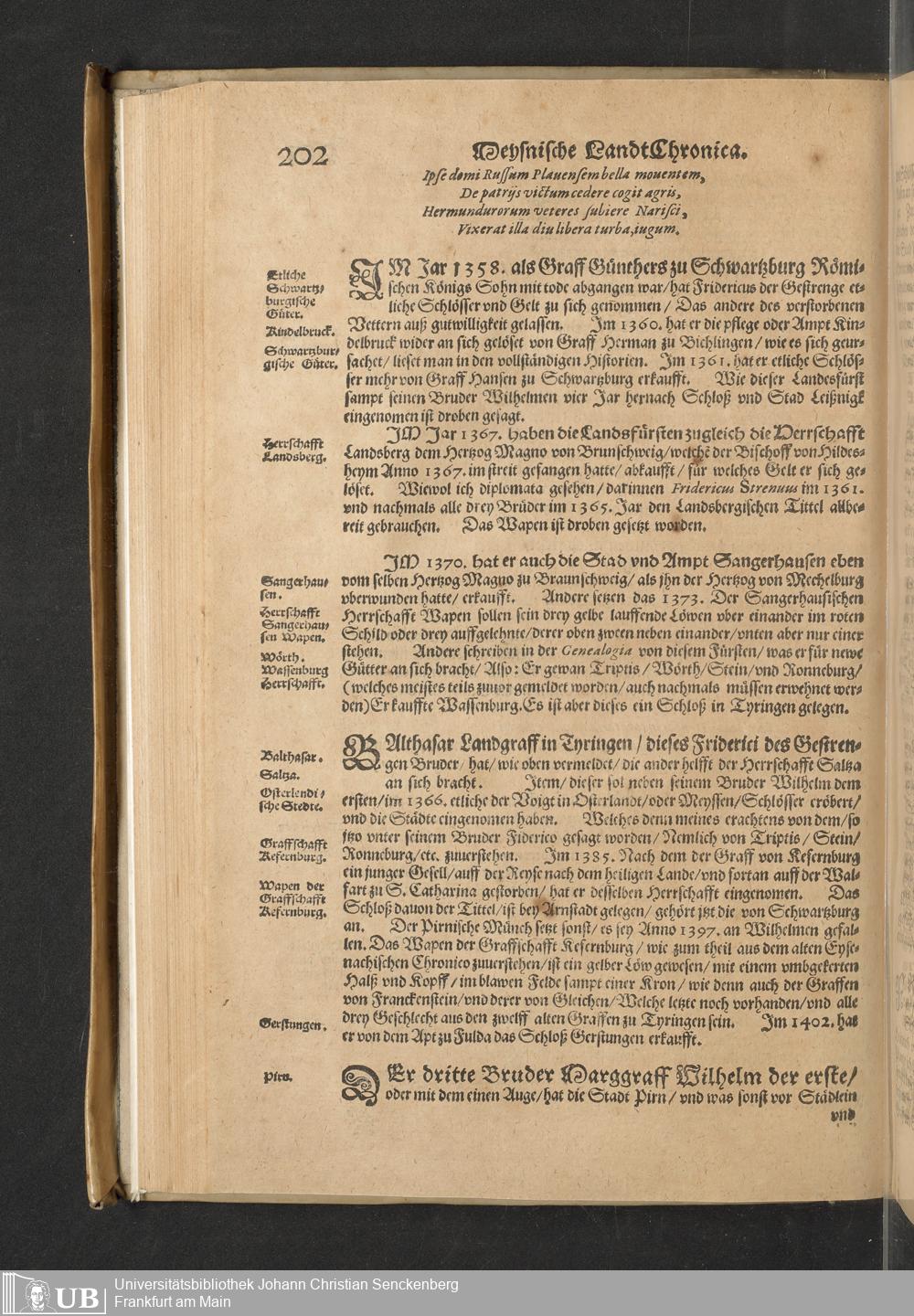 Meißnische Land vnd Berg-Chronica, : Jn welcher ein vollnstendige description des Landes, so zwischen der Elbe, Sala vnd Südödischen Behmischen gebirgen gelegen, So wol der dorinnen begriffenen auch anderer Bergwercken, sampt zugehörigen Metall vn[d] Metallar beschreibungen. : Mit einuorleibten fürnehmen Sächsischen, Düringischen vnd Meißninschen Historien. : Auch nicht wenig Tafeln, Wapen vnd Antiquiteten, derer etliche in Kupffer gestochen. / Gestellet durch Petrum Albinum M. Churf. Sech. Secr. ..