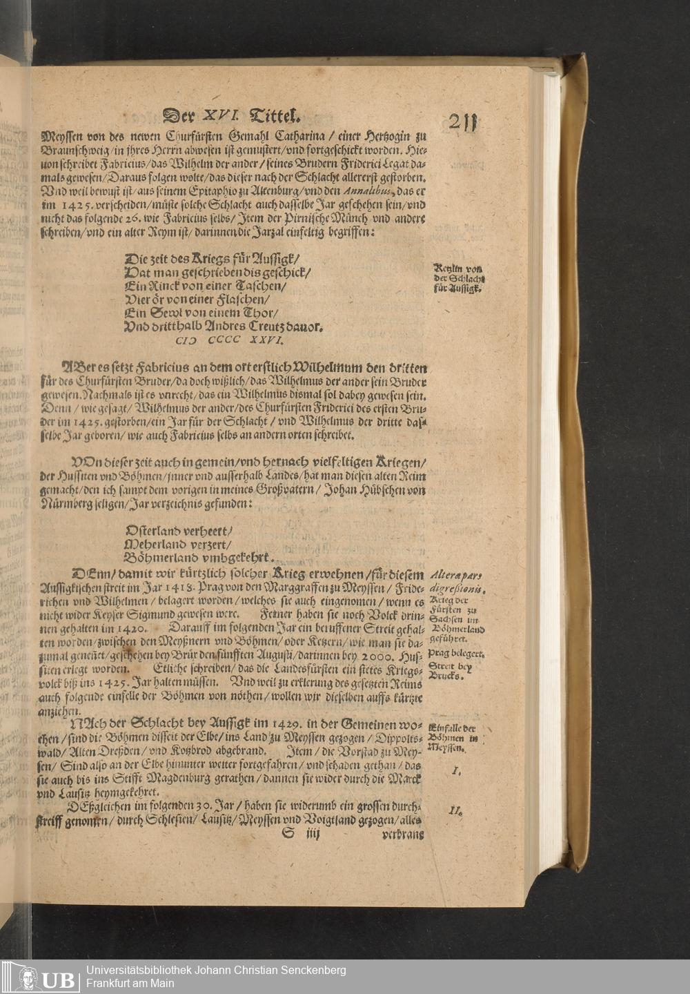 Meißnische Land vnd Berg-Chronica, : Jn welcher ein vollnstendige description des Landes, so zwischen der Elbe, Sala vnd Südödischen Behmischen gebirgen gelegen, So wol der dorinnen begriffenen auch anderer Bergwercken, sampt zugehörigen Metall vn[d] Metallar beschreibungen. : Mit einuorleibten fürnehmen Sächsischen, Düringischen vnd Meißninschen Historien. : Auch nicht wenig Tafeln, Wapen vnd Antiquiteten, derer etliche in Kupffer gestochen. / Gestellet durch Petrum Albinum M. Churf. Sech. Secr. ..