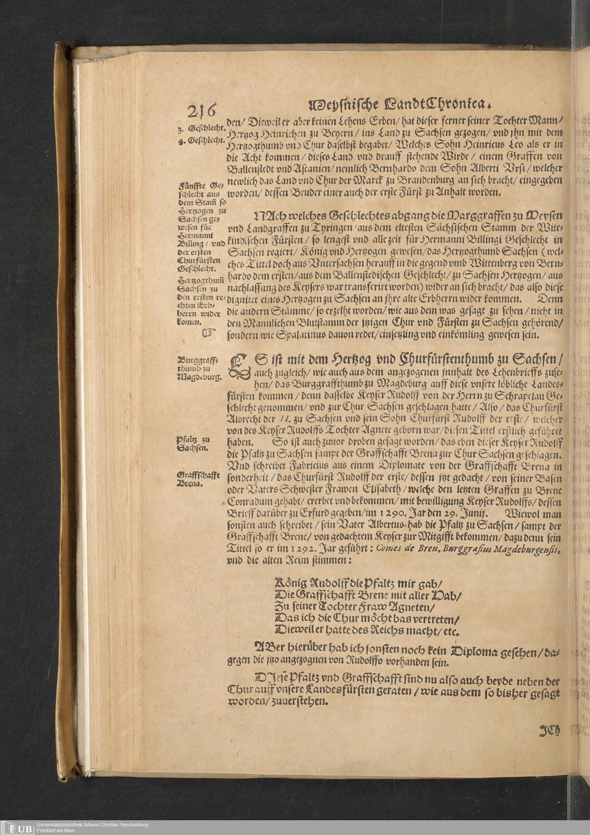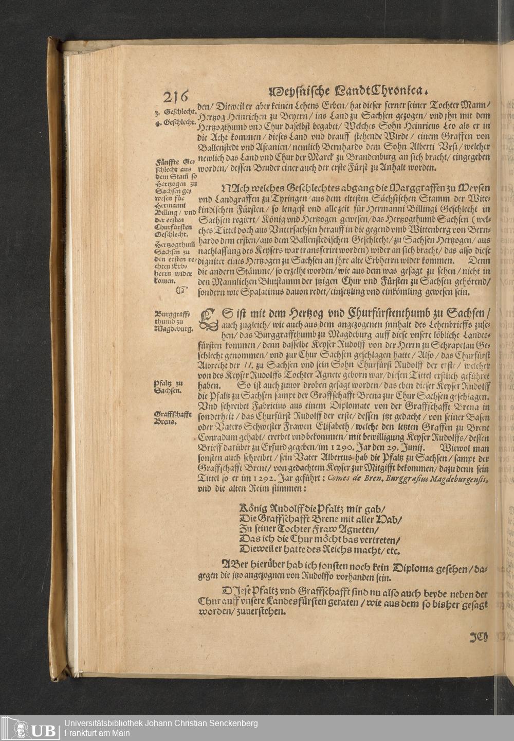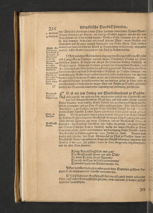 Meißnische Land vnd Berg-Chronica, : Jn welcher ein vollnstendige description des Landes, so zwischen der Elbe, Sala vnd Südödischen Behmischen gebirgen gelegen, So wol der dorinnen begriffenen auch anderer Bergwercken, sampt zugehörigen Metall vn[d] Metallar beschreibungen. : Mit einuorleibten fürnehmen Sächsischen, Düringischen vnd Meißninschen Historien. : Auch nicht wenig Tafeln, Wapen vnd Antiquiteten, derer etliche in Kupffer gestochen. / Gestellet durch Petrum Albinum M. Churf. Sech. Secr. ..